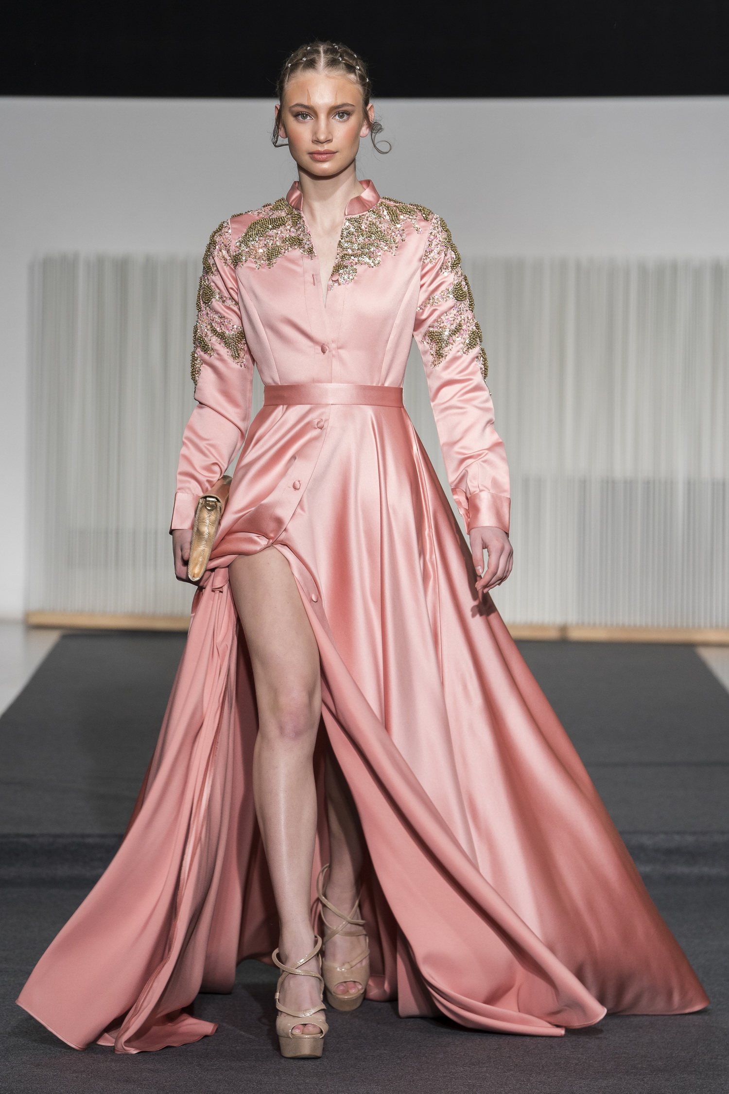 Look 19 - maxi robe chemise en satin duchesse rose poudre applique de broderies en relief vieil or - soft pink duchess satin maxi shirt dress with relief beading - Sasha