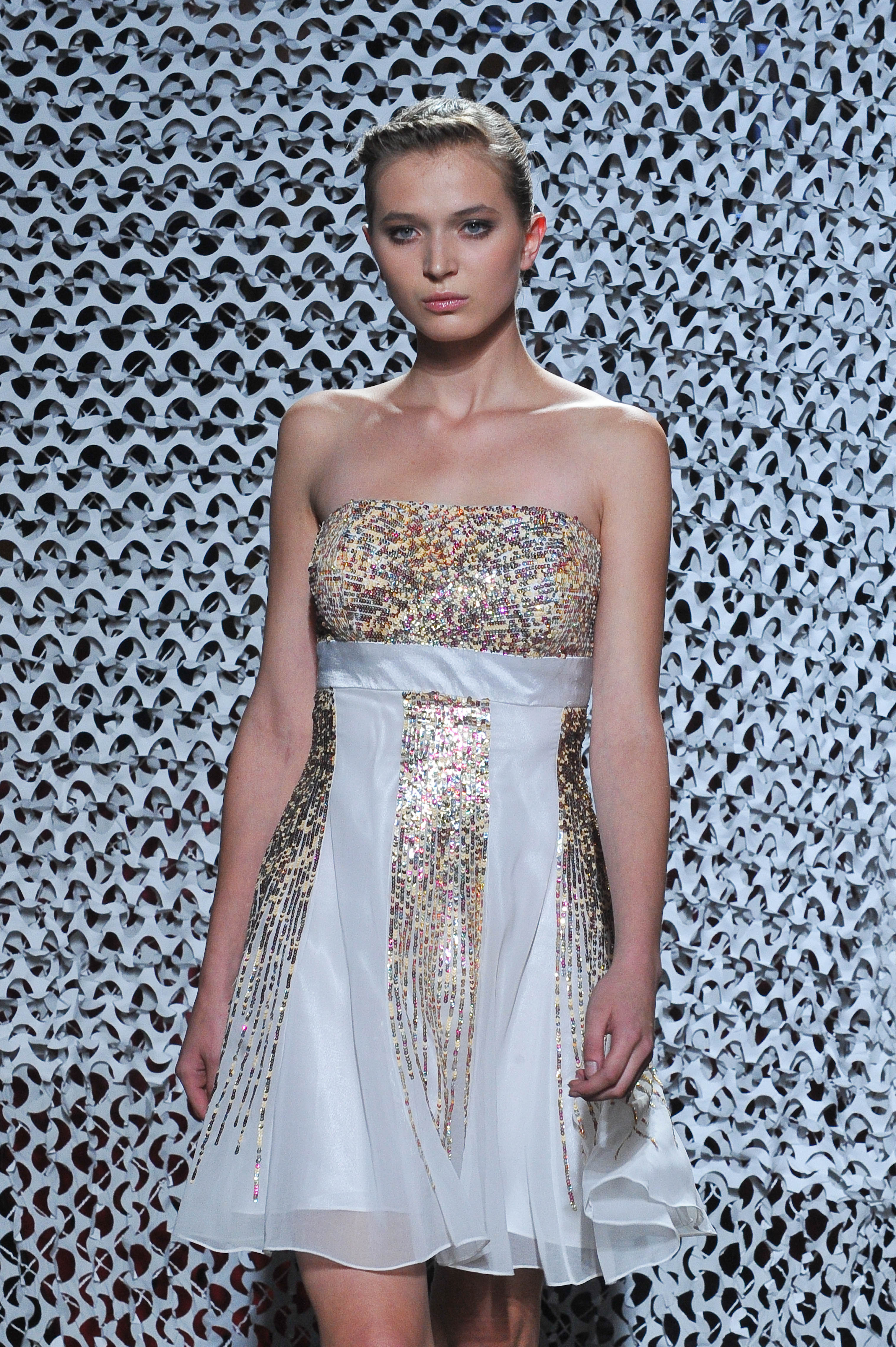 White silk georgette babydoll minidress with sequined panels. Spring-Summer 2013 fashion show «Muse» - Christophe Guillarme Paris - Tuesday September 25th, 2012 at Balajo - Paris Fashion Week