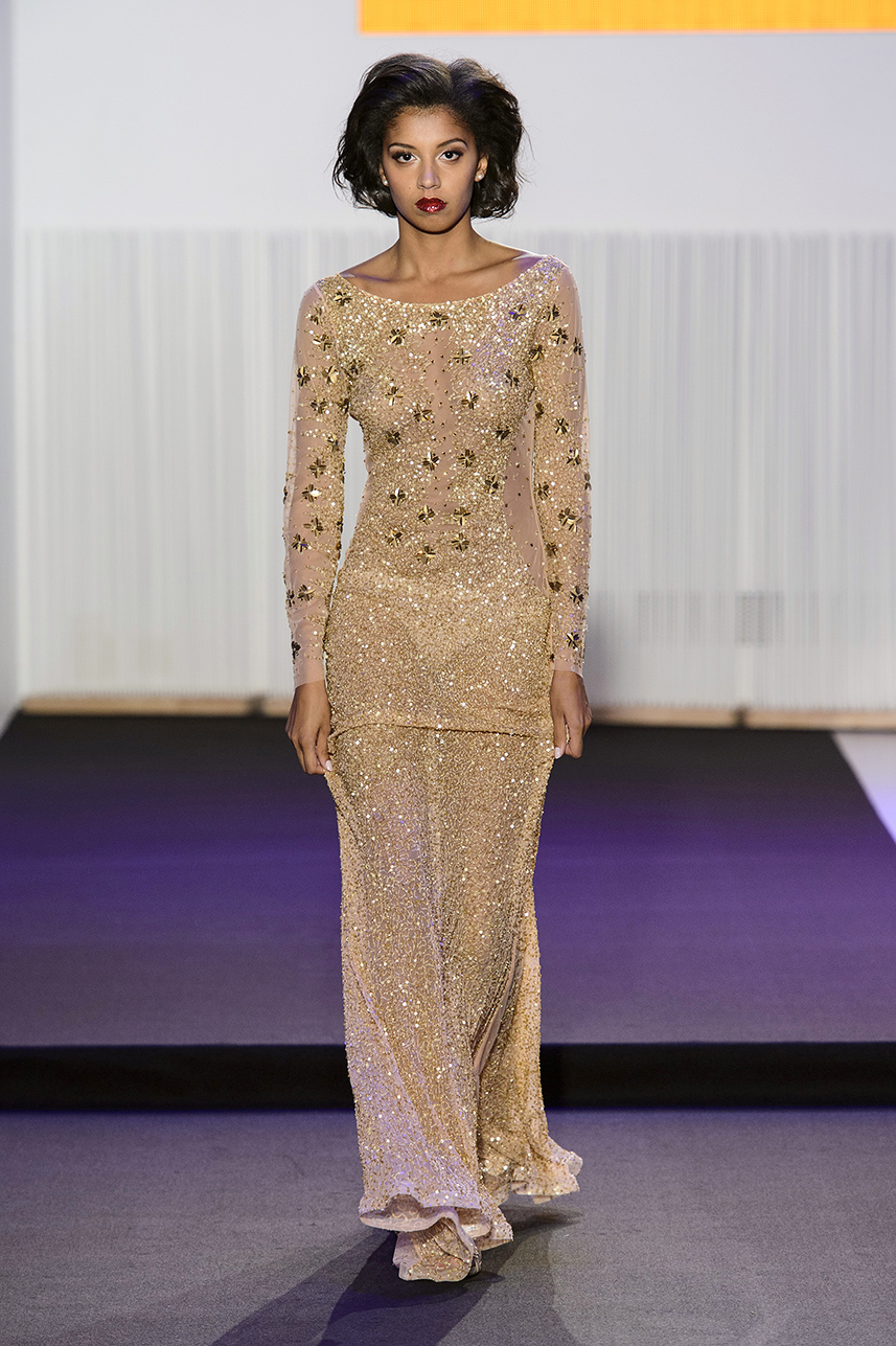 Look 20 - fourreau en tulle champagne rebrode de sequins dores - black Long dress sheath in tulle champagne embroidered of golden sequins - Marjorie
