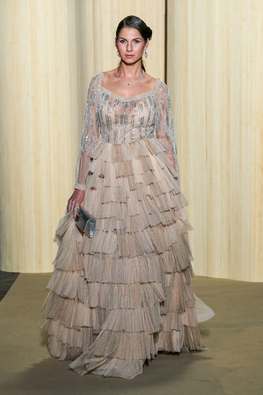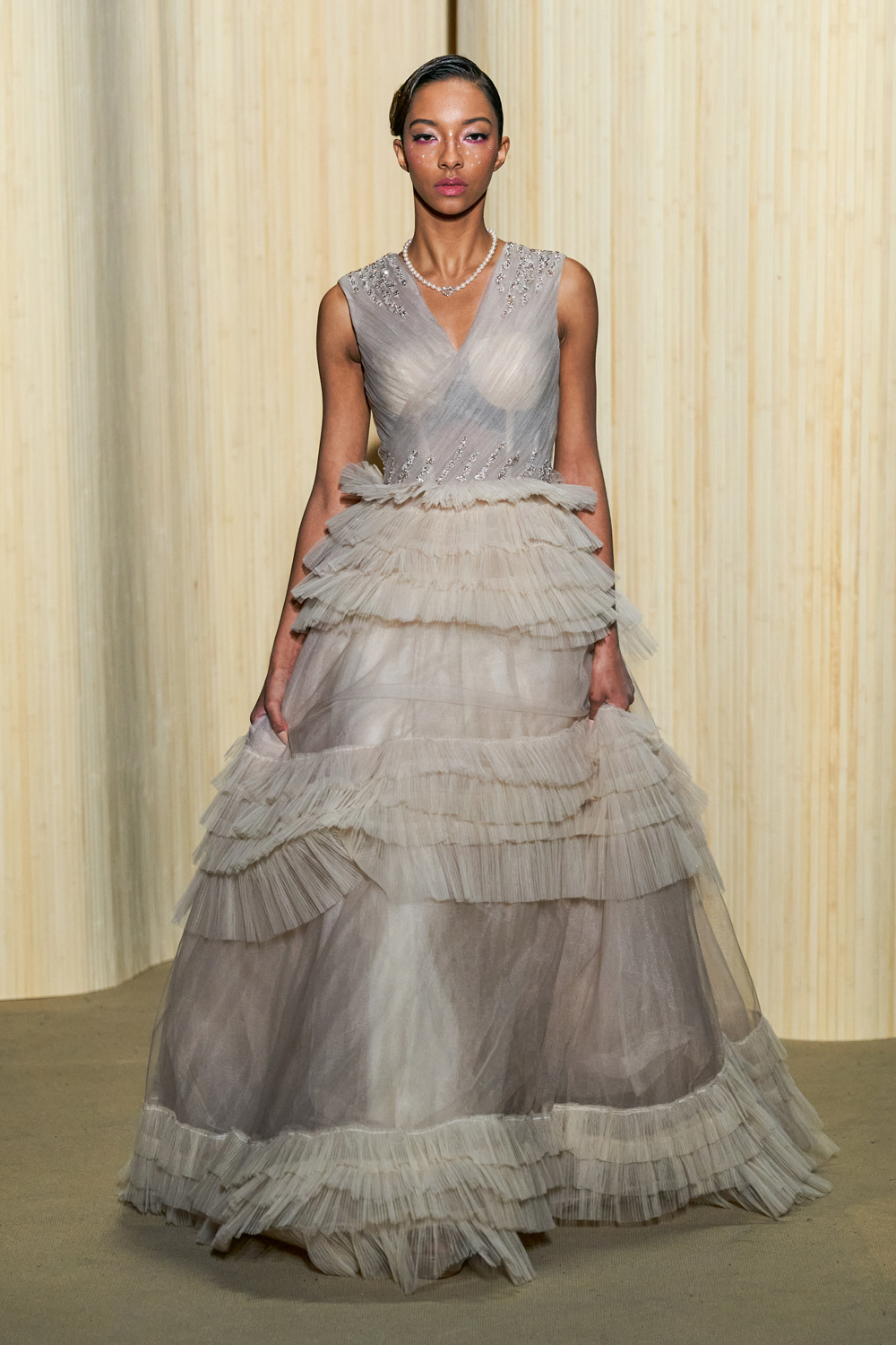 with tuxedos enhanced with feathers. Transparencies of soft pink tulle sprinkled with crystals and extravagant embroidery complete this dreamlike and burlesque vision. Maxi dresses in crumpled tulle reveal the audacity of this first muse of glamour.