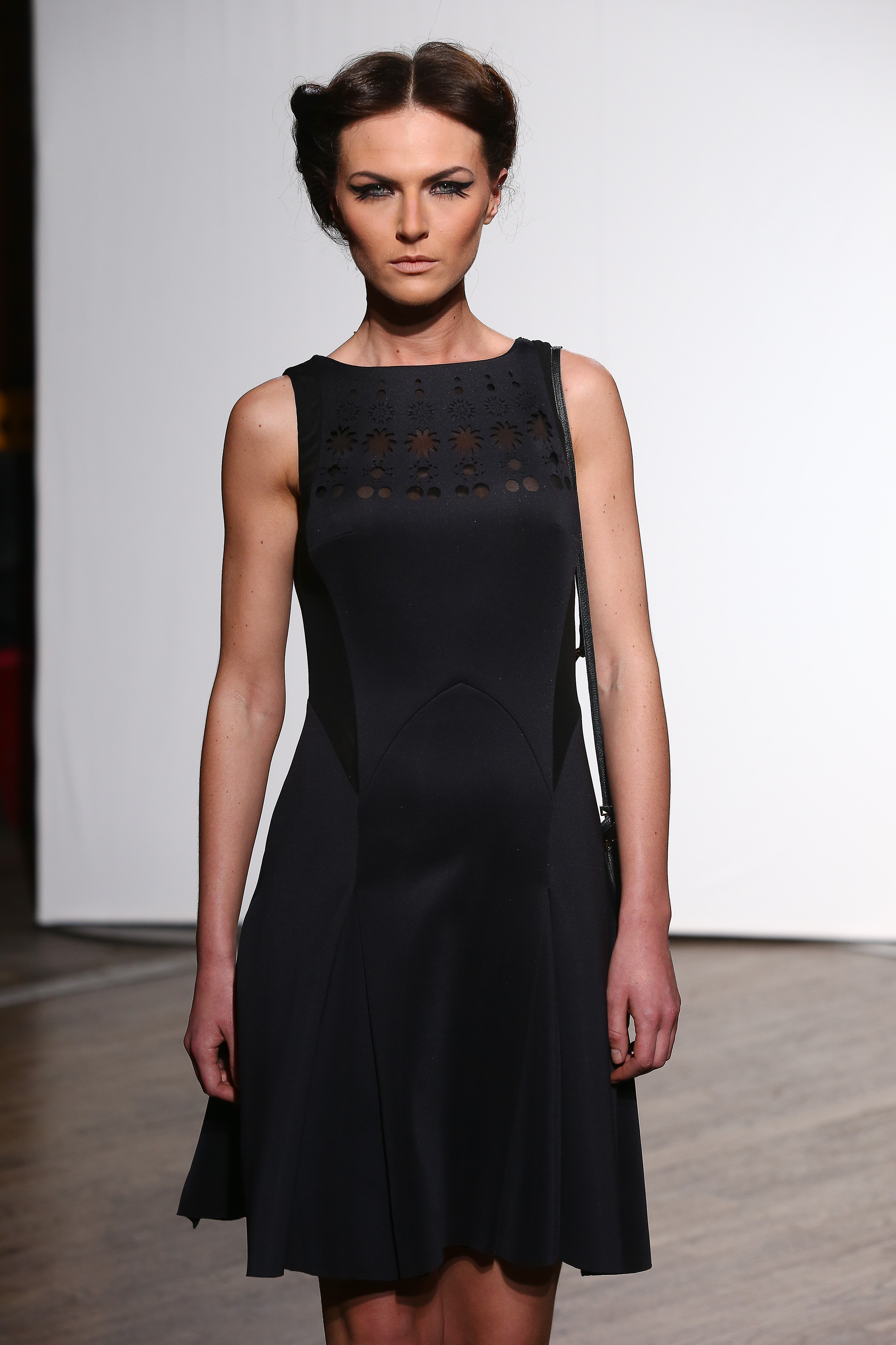 Robe en neoprene noir decoupe au laser. Black neoprene dress with lasercut on neckline. Lucie.