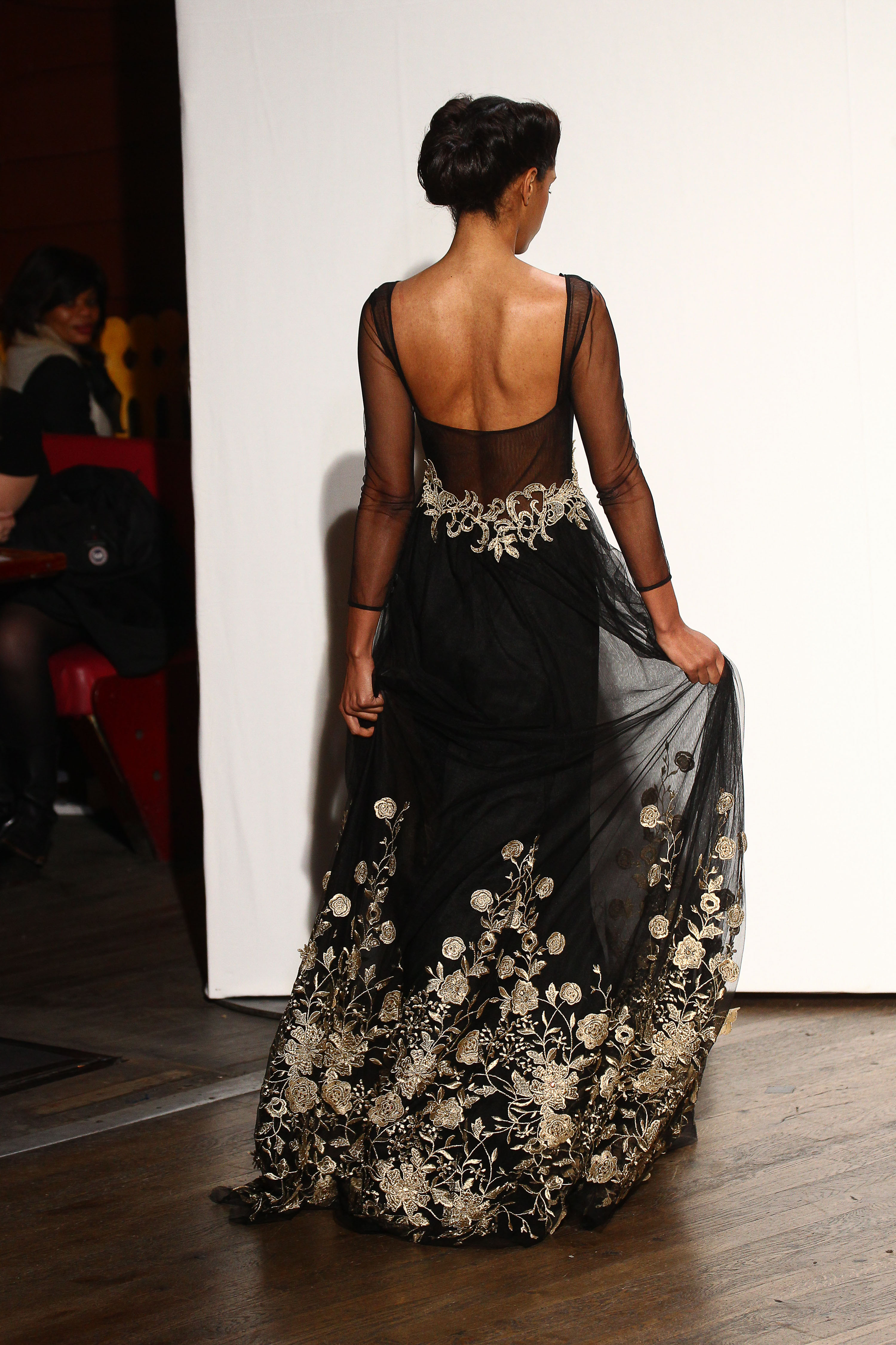 Maxi robe en tulle noire bordee d’applications de broderies florales dorees. Black tulle maxi dress with a large golden flower embroideries border at the hem. Mandy.