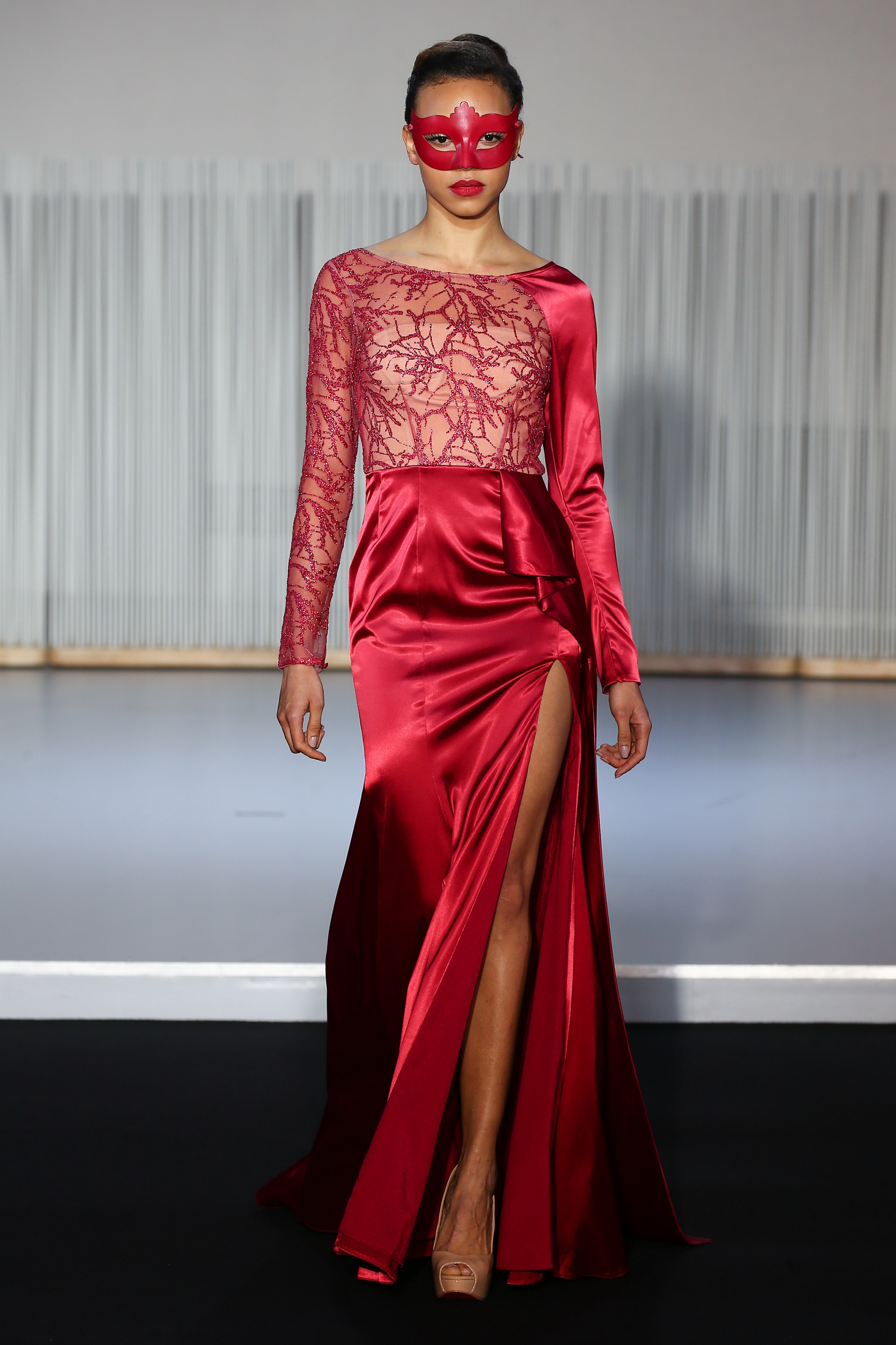 look 15 - fourreau fendu en jersey bordeaux glace et tulle incruste de paillettes - burgundy coated jersey gown mix with glittery mesh - Dany