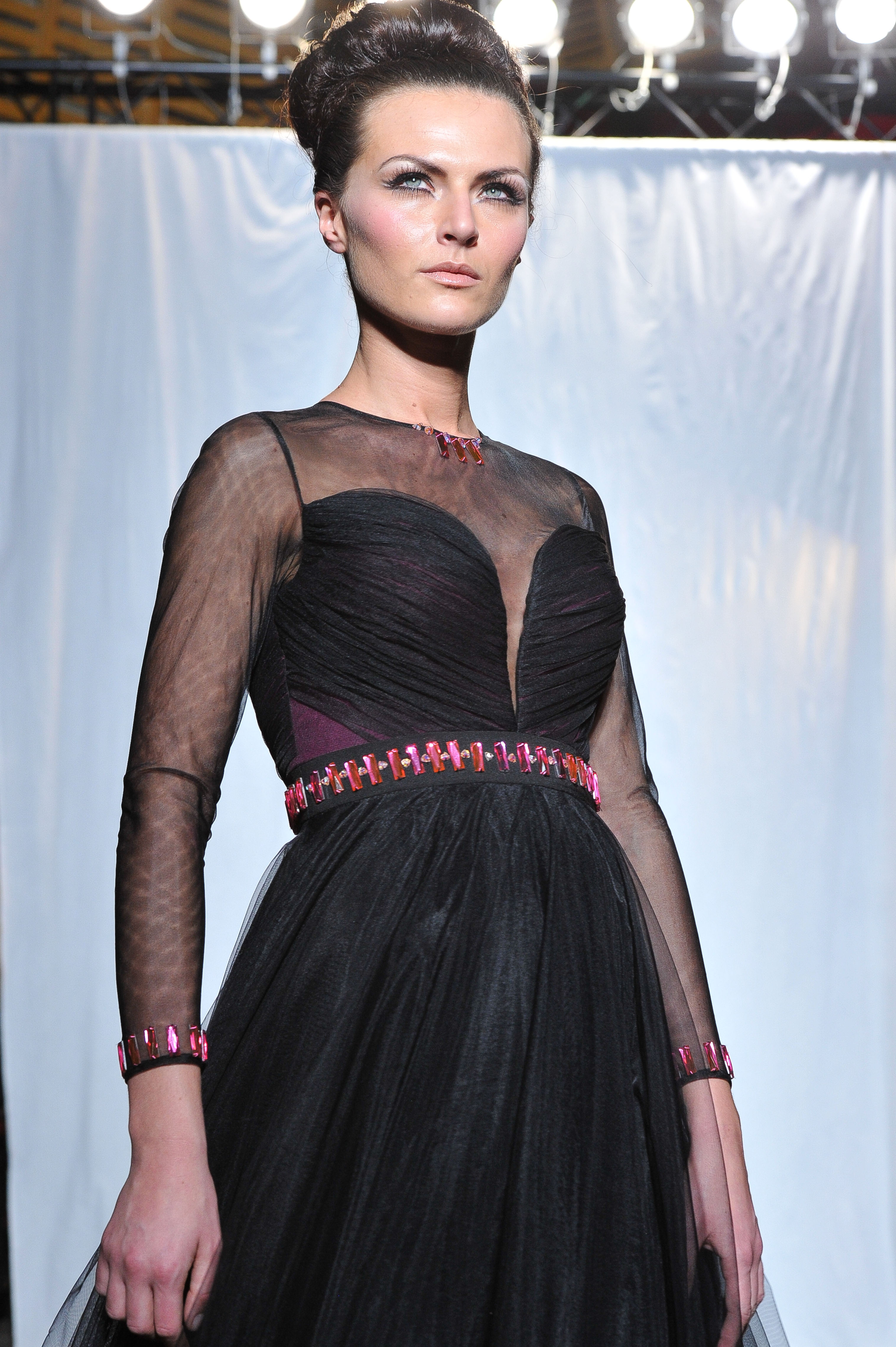 Maxi robe en tulle noir au buste fendu. Black maxi dress with sheer plunging neckline. Lucie.