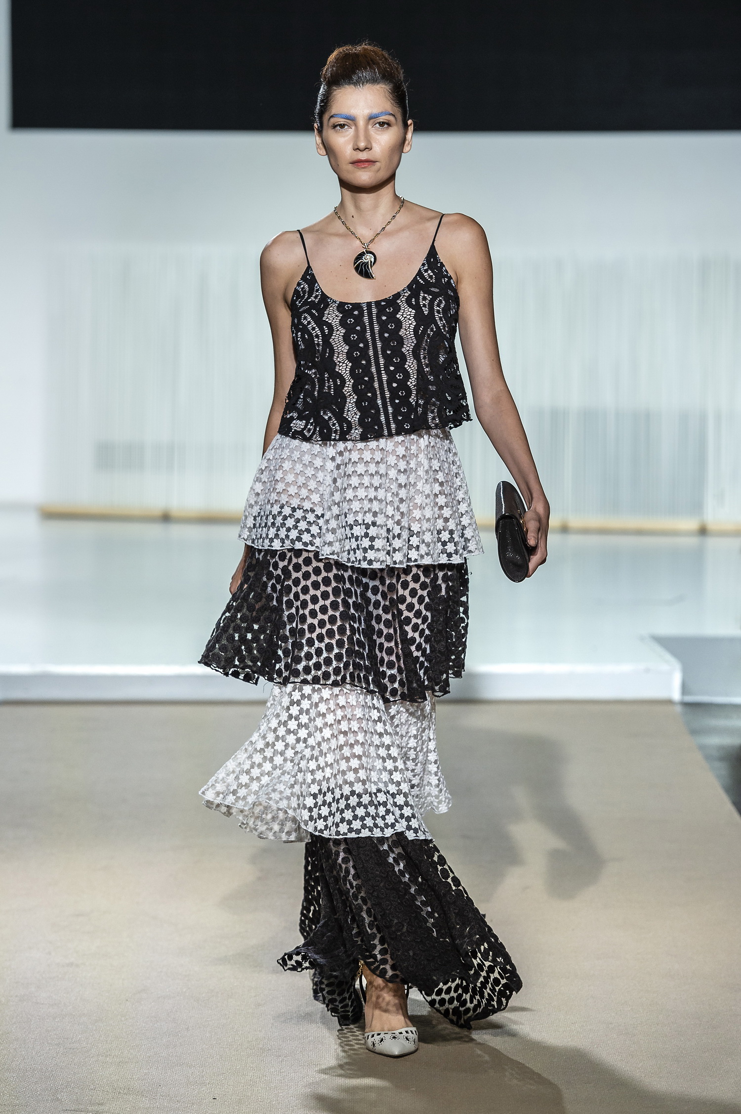The collection is then inspired by a foggy waking dream fill with tulle fabric in the middle of a graphic chessboard. Virginal white Silk chiffon , alternate with maxi abstract printed in beige nude outline with red and azure.