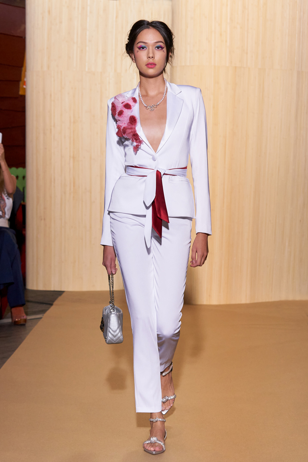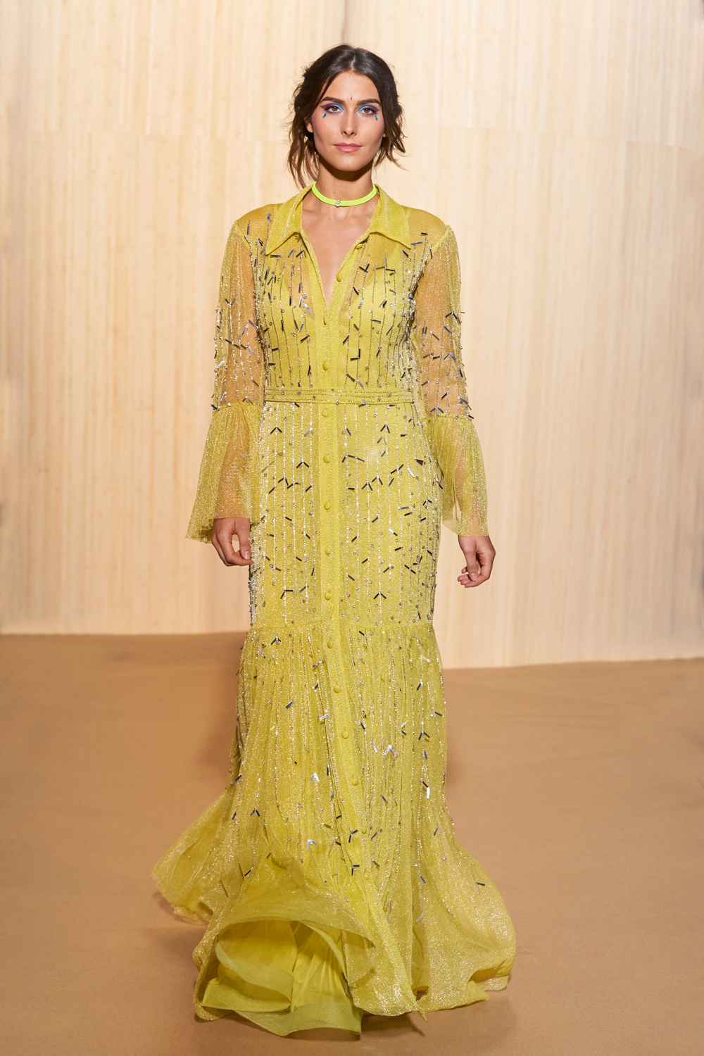 The gradient dyeing from white to dark fuchsia pink contrasts with the tones of saffron and golden anise green. A range of warm and spicy colors in a bold, camp-tinged collection.