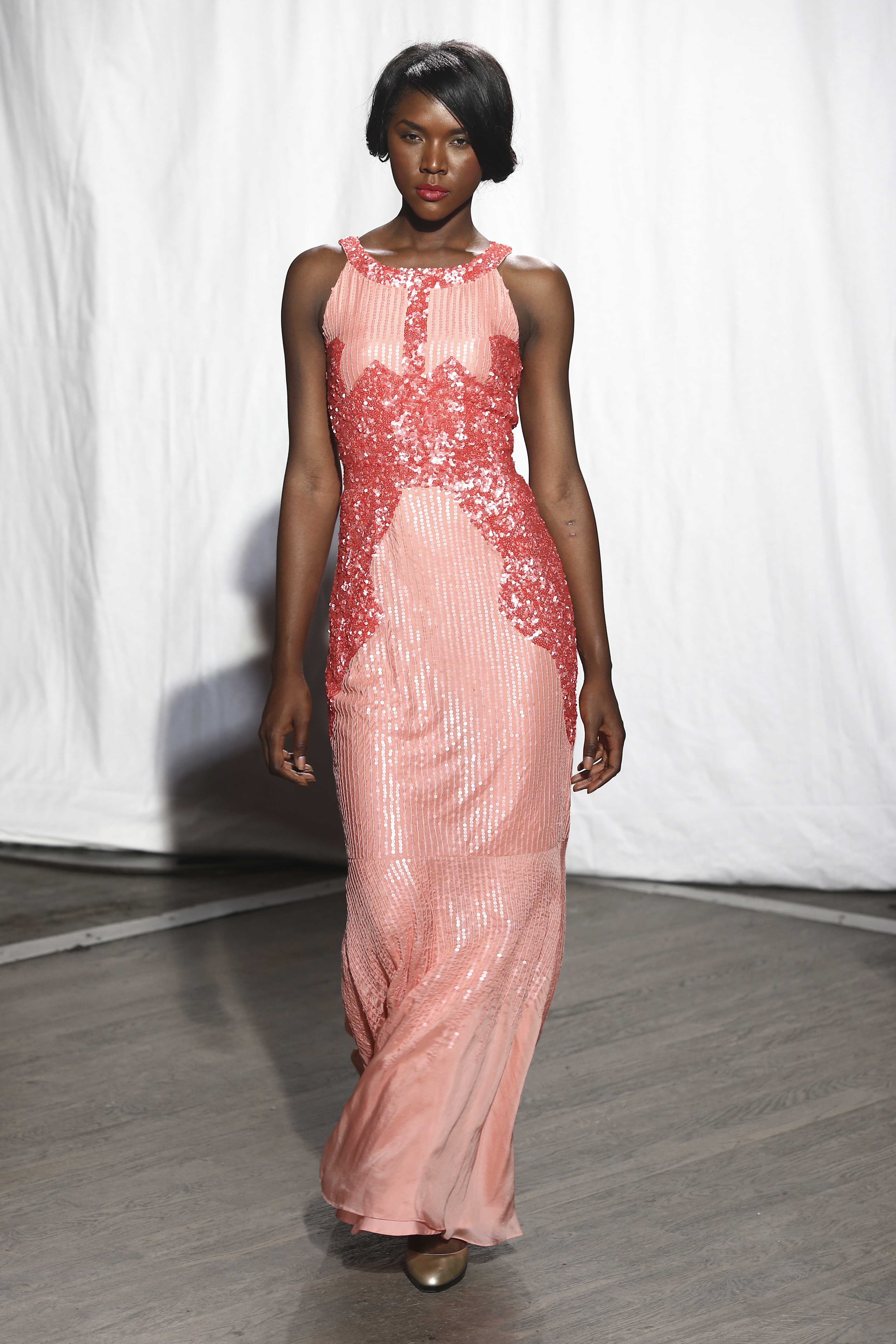 Starting with neon yellow neoprene lasercut minidress, golden vintage applique lace on duchess satin either powder pink or mango colours, and sheer cleavage in champagne or neon pink outline with beading, all are playing up the couture shape of each style. Seethrow black or white organza is adorned with off-white floral thread embroideries in a kinetic artistic way.