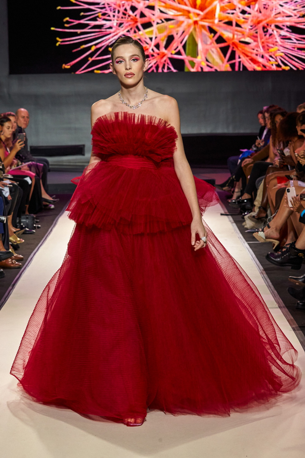 Dans ces transparences de tulle rose poudré, de broderies de fleurs délicates, la collection est une croisière onirique dans un jardin secret. Quelques silhouettes de plantes carnivores esprit Poison Ivy comme ces maxi robes bustier en tulle froissé rouge où les volumes en satin dramatise cette nature revisitée.