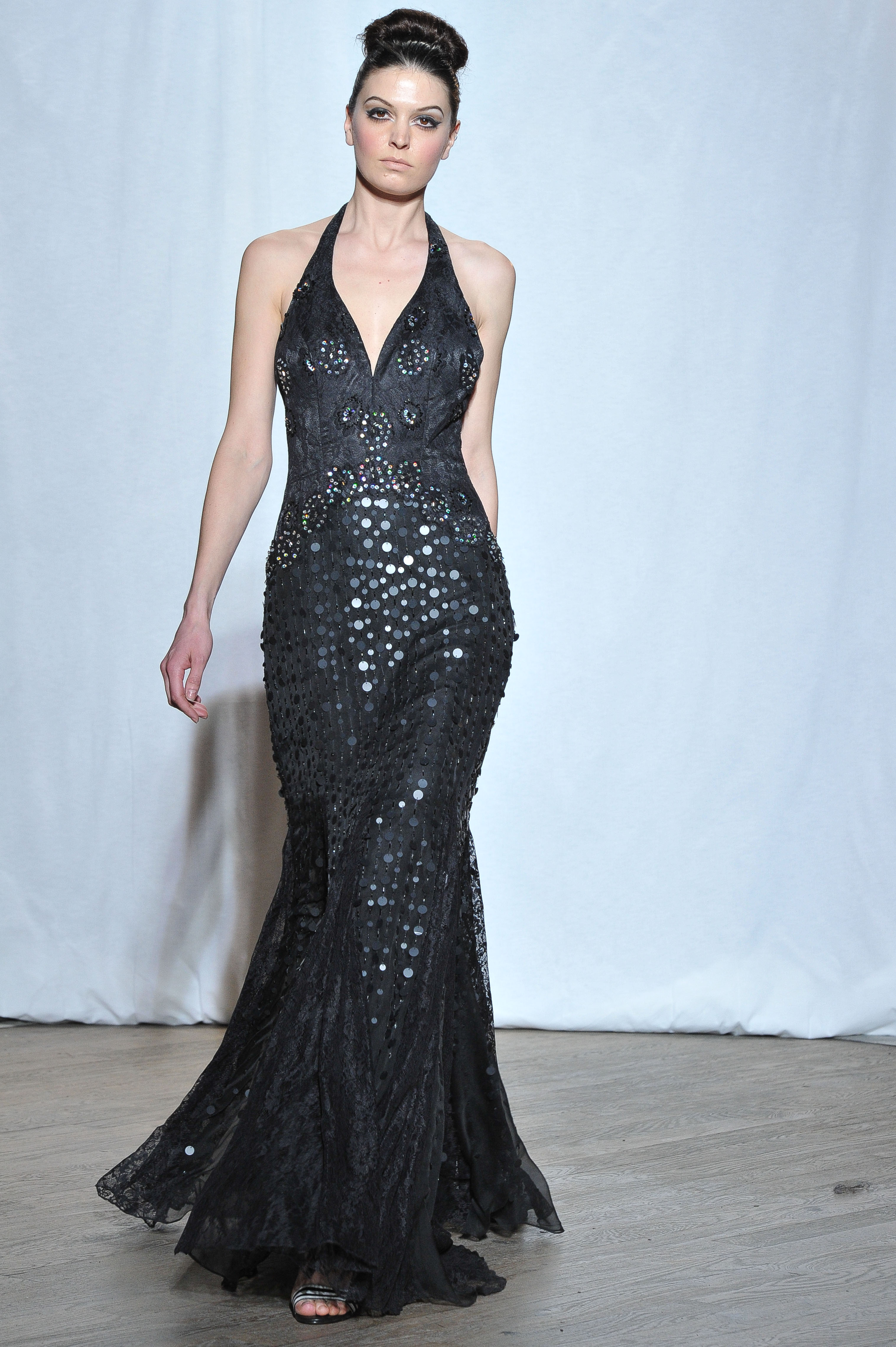 Fourreau noir en dentelle et mousseline de soie à ligne de paillettes. Embroidered lace and silk chiffon gown with lines of black sequins. Xenia.