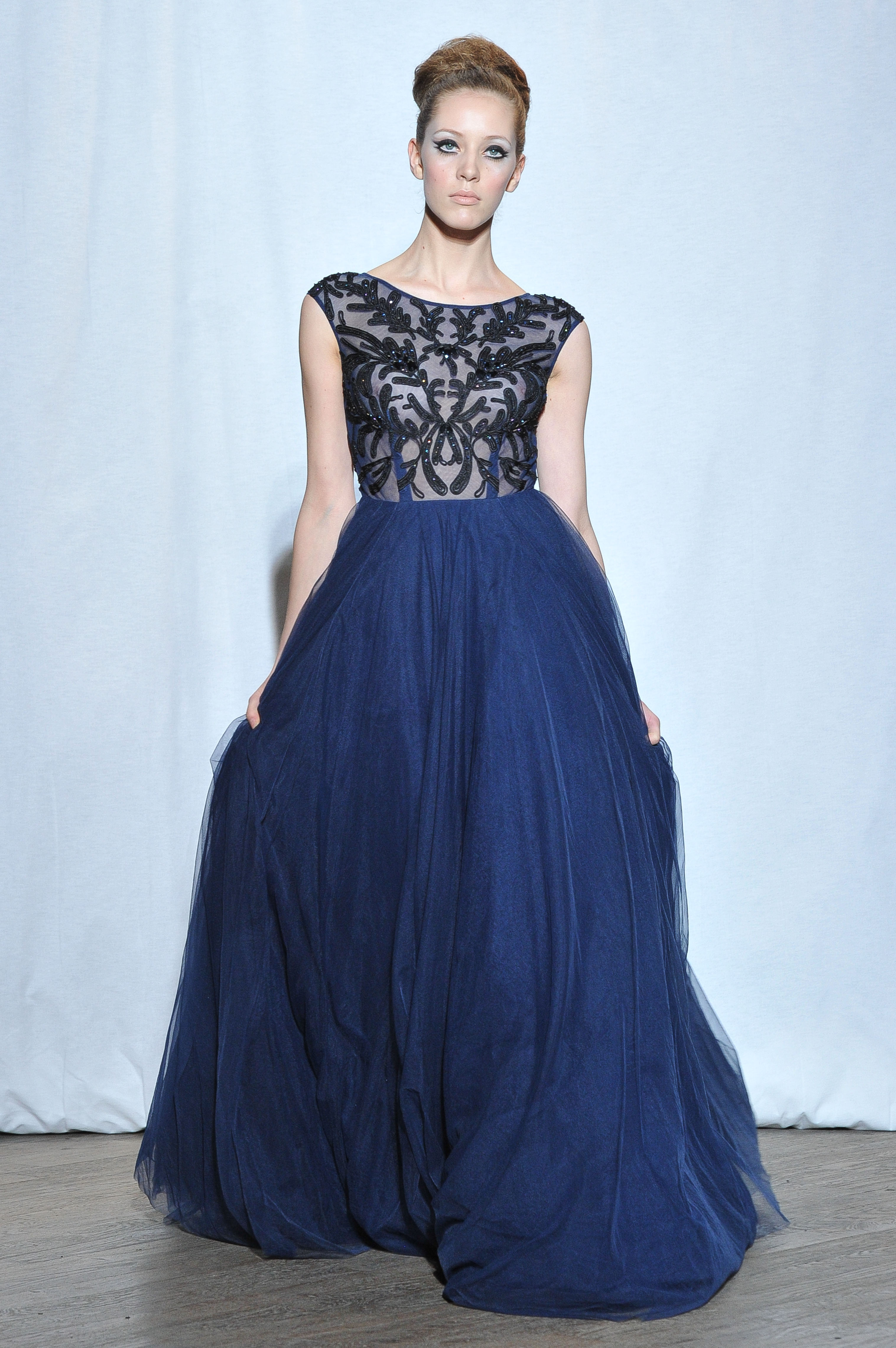 Maxi robe en tulle bleu marine et buste en tulle transparent rebrodé et souligné de pierreries. Navy blue maxi dress with sheer top embroidered and beaded. Ave.