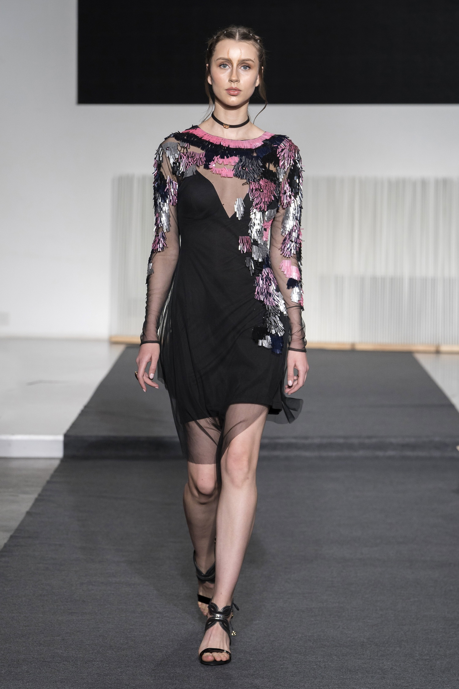 Look 8 - mini robe en tulle noir rebrode de franges de paillettes argent et rose - black tulle mini dress adorned with fringes of silver and pink sequins - Anna