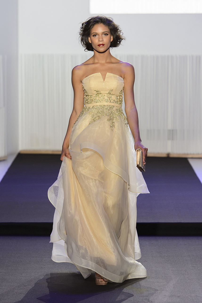 Look 22 - longue robe bustier en organza champagne appliquee de dentelles dorees a la taille - bustier dress in champagne organza applied with gold lace on the waist - Keiera