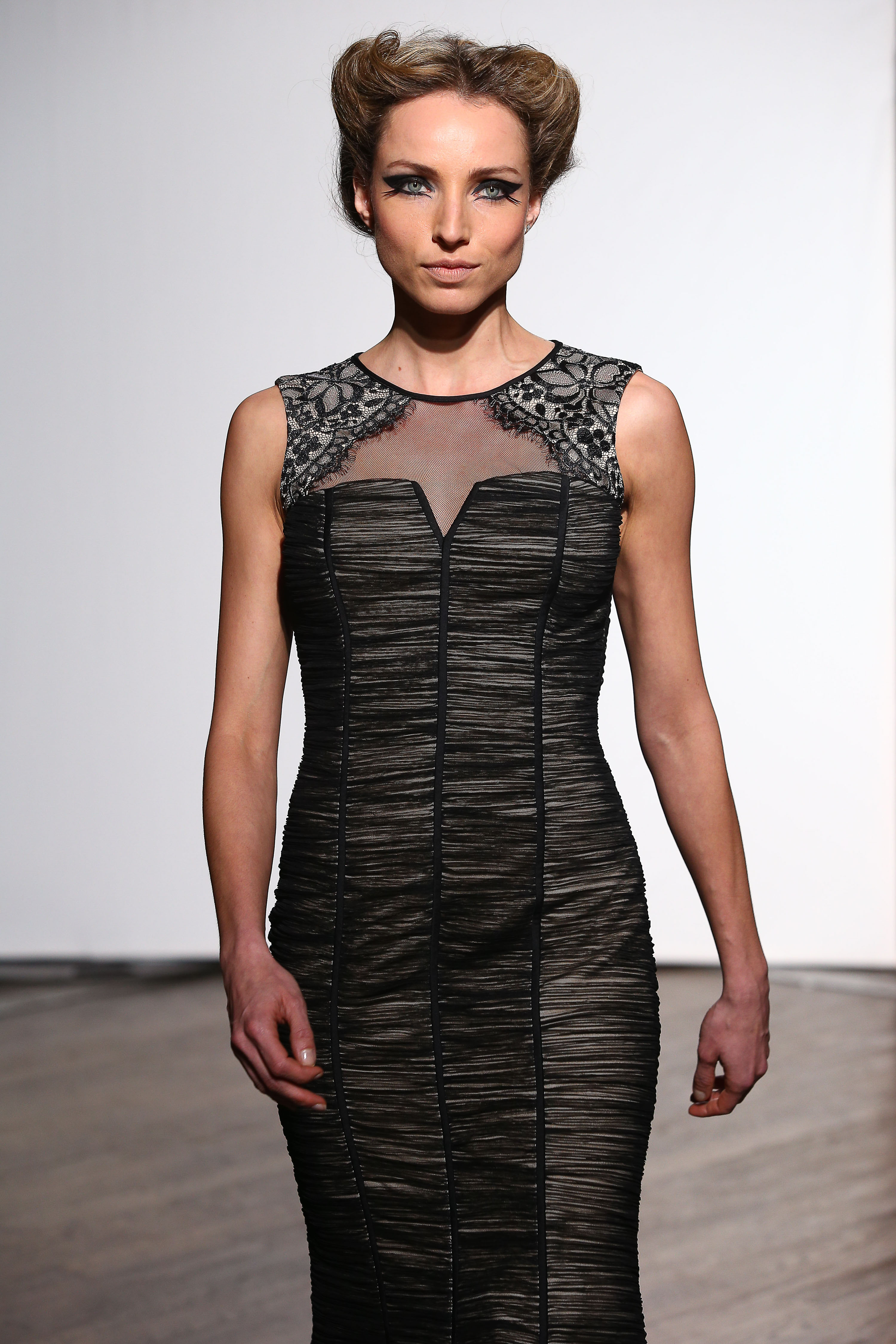 Fourreau en tulle fronce aux epaules en dentelle noire. Black gathered tulle gown with black lace on shoulders. Olivia.