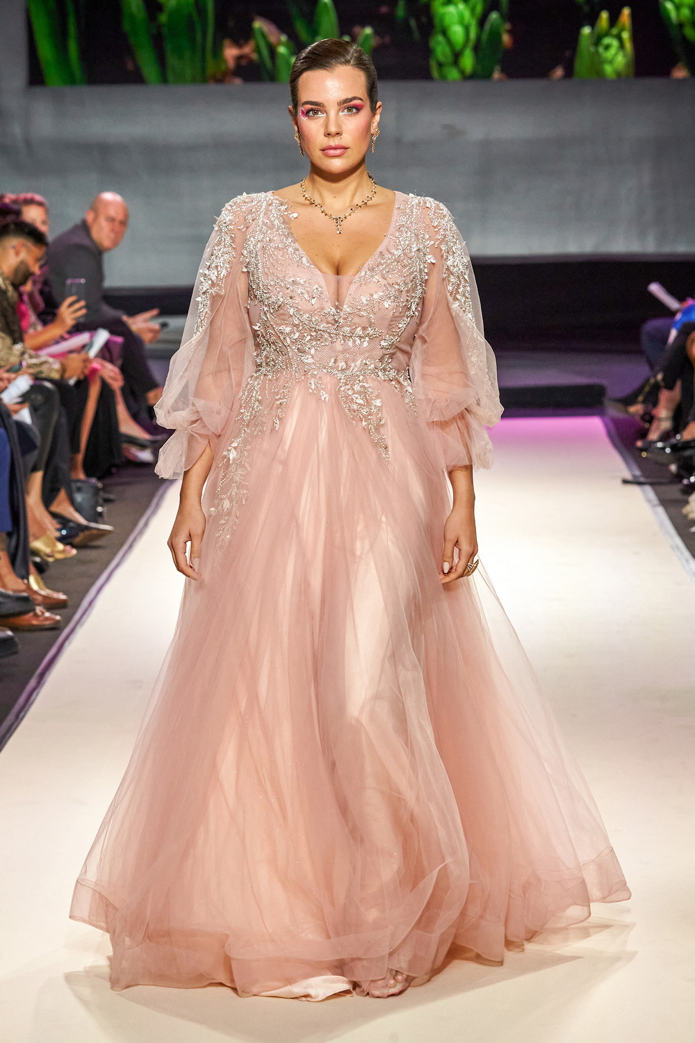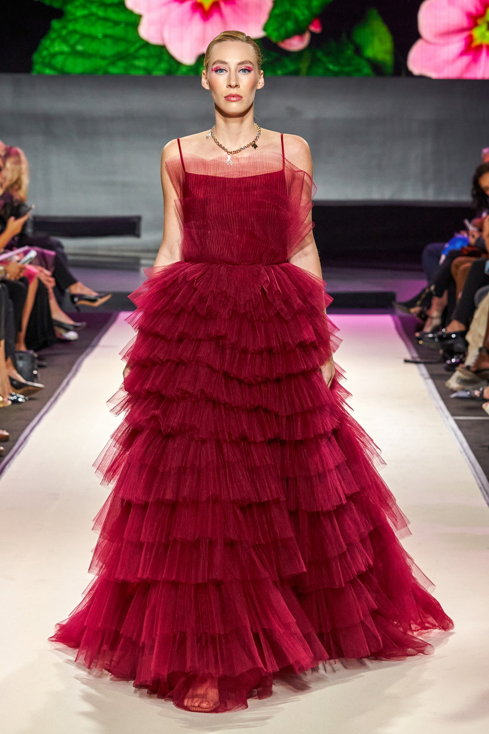 Dans ces transparences de tulle rose poudré, de broderies de fleurs délicates, la collection est une croisière onirique dans un jardin secret. Quelques silhouettes de plantes carnivores esprit Poison Ivy comme ces maxi robes bustier en tulle froissé rouge où les volumes en satin dramatise cette nature revisitée.
