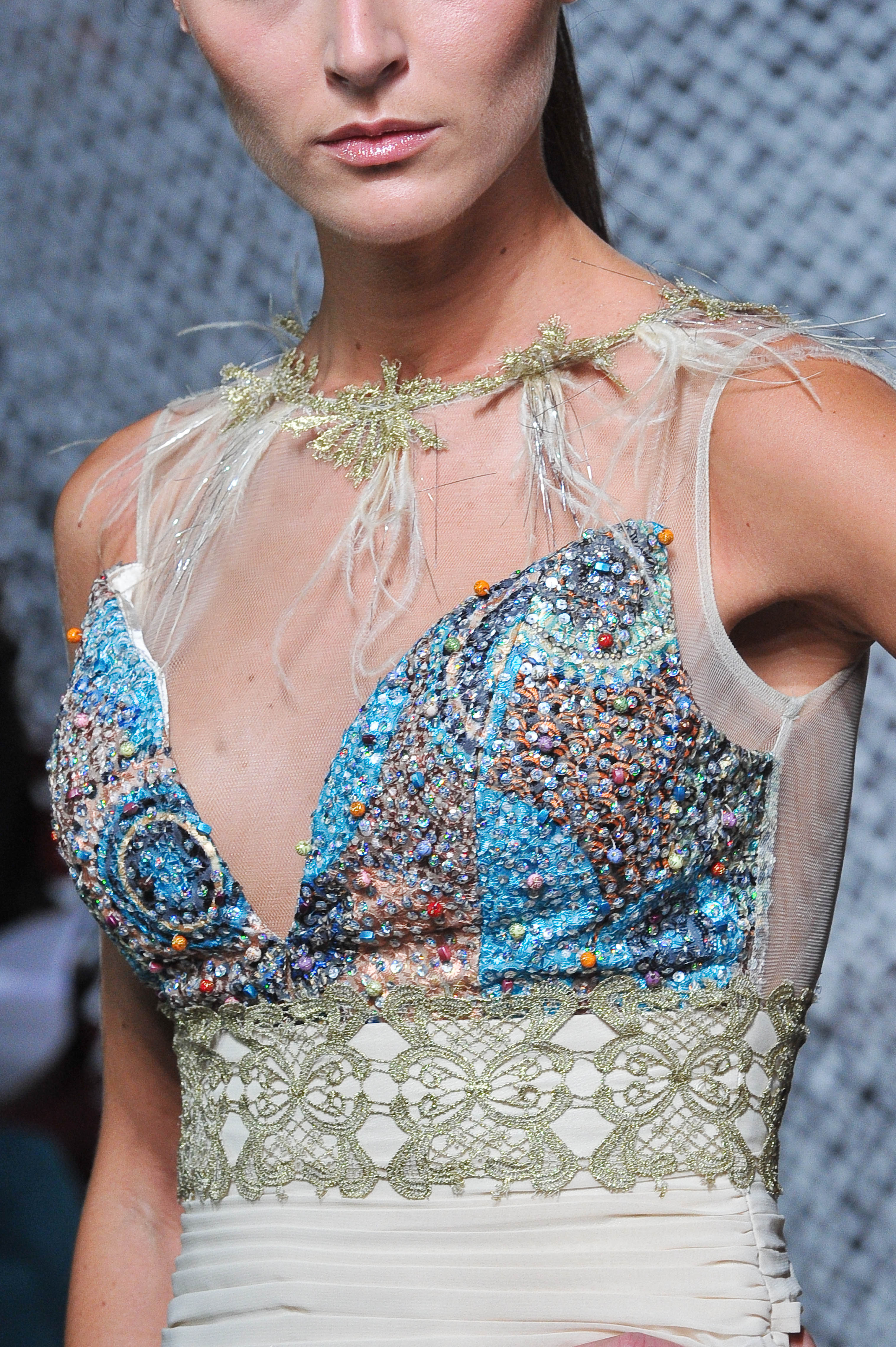 Ivory silk georgette maxidress and a tulle bustier lined with feathers and gold guipures. Spring-Summer 2013 fashion show «Muse» - Christophe Guillarme Paris - Tuesday September 25th, 2012 at Balajo - Paris Fashion Week