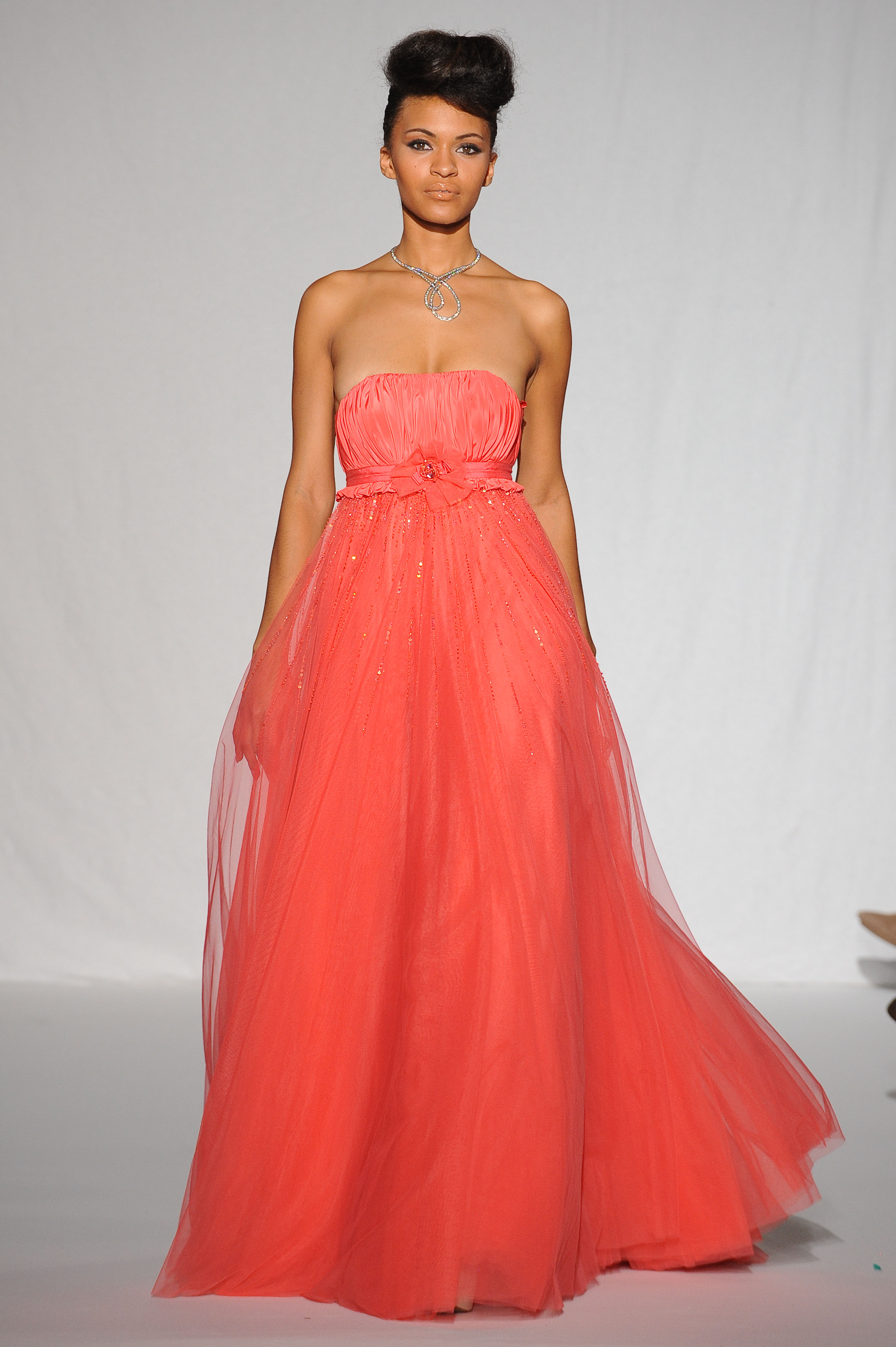 Final dress : Maxi robe bustier en tulle corail rebrodé. Coral pink tulle maxi bustier dress with beading. Auline Grac