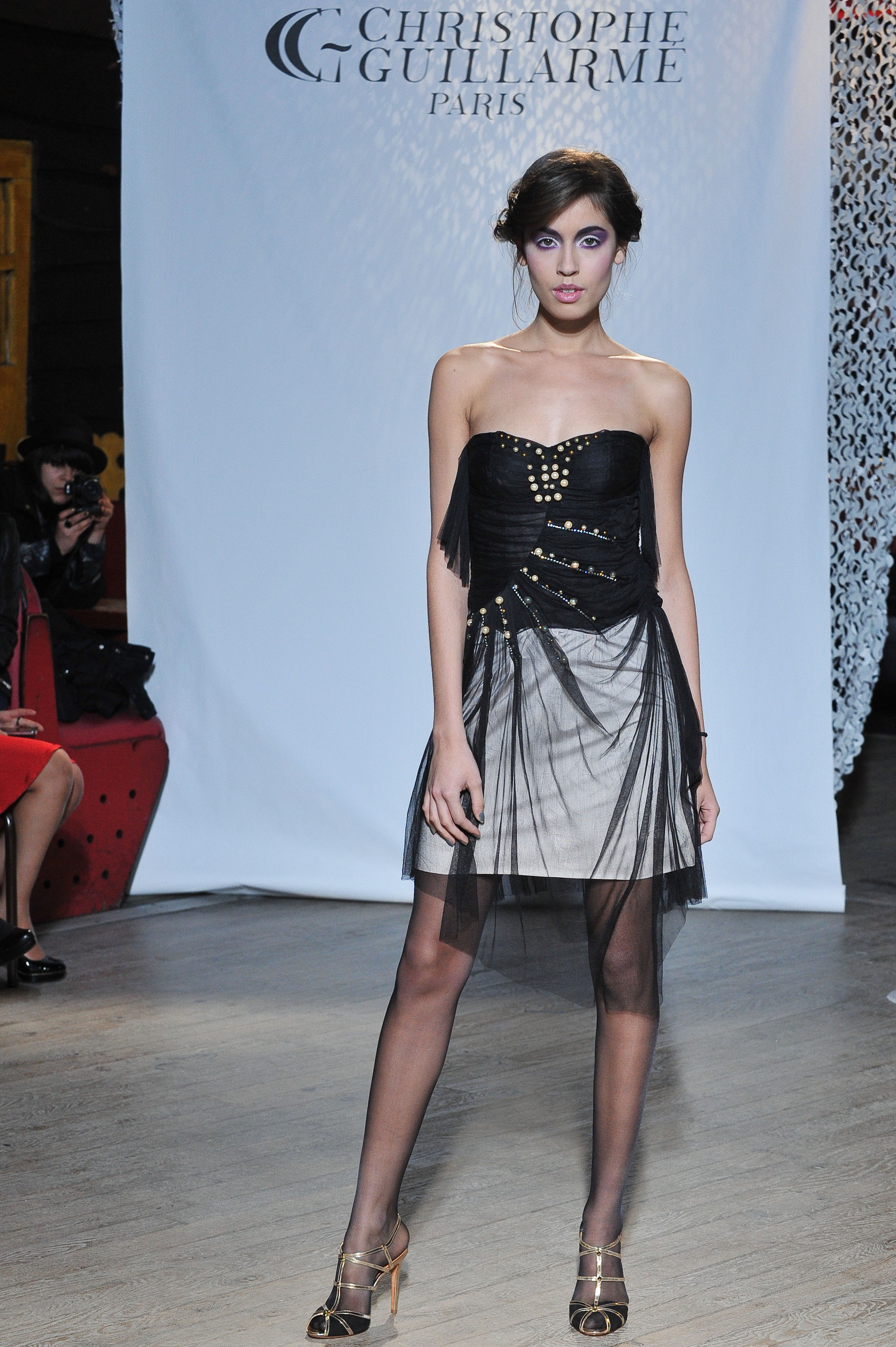 Fall-Winter 2013-2014 fashion show «Boheme» - Christophe Guillarme Paris - Tuesday February 26th 2013 at Balajo - Paris Fashion Week - Mini robe drapée en tulle de soie noire rebrodée de lignes de cristal. - Black draped silk tulle mini dress beaded with crystal lines. Isabella
