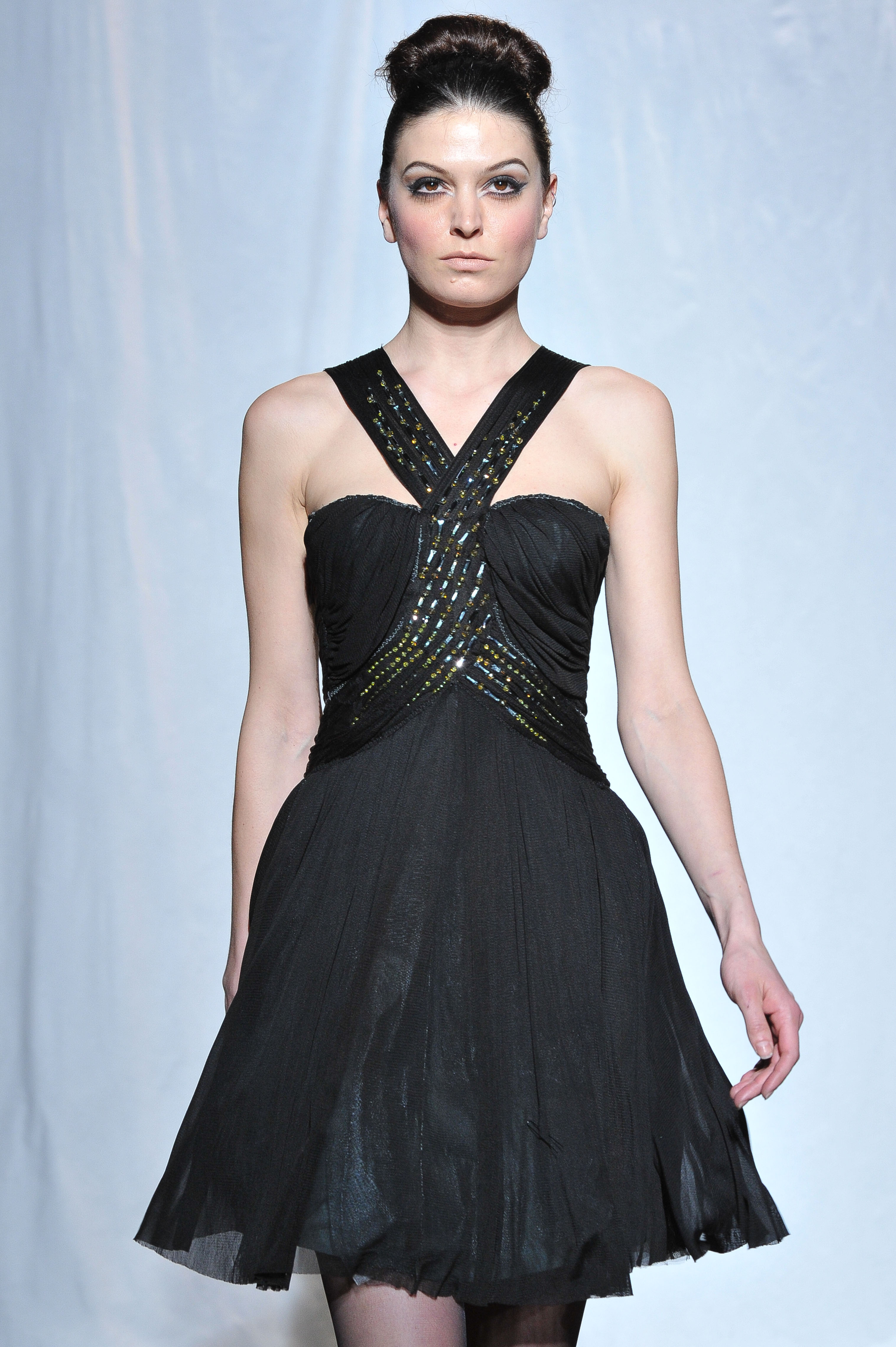 Mini robe en tulle de soie noire à bretelles croisées rebrodées. Black silk tulle Mini dress with front crossed beaded straps. Xenia. Christophe Guillarme Collection Automne-Hiver 2014-2015 "Miss Polly"