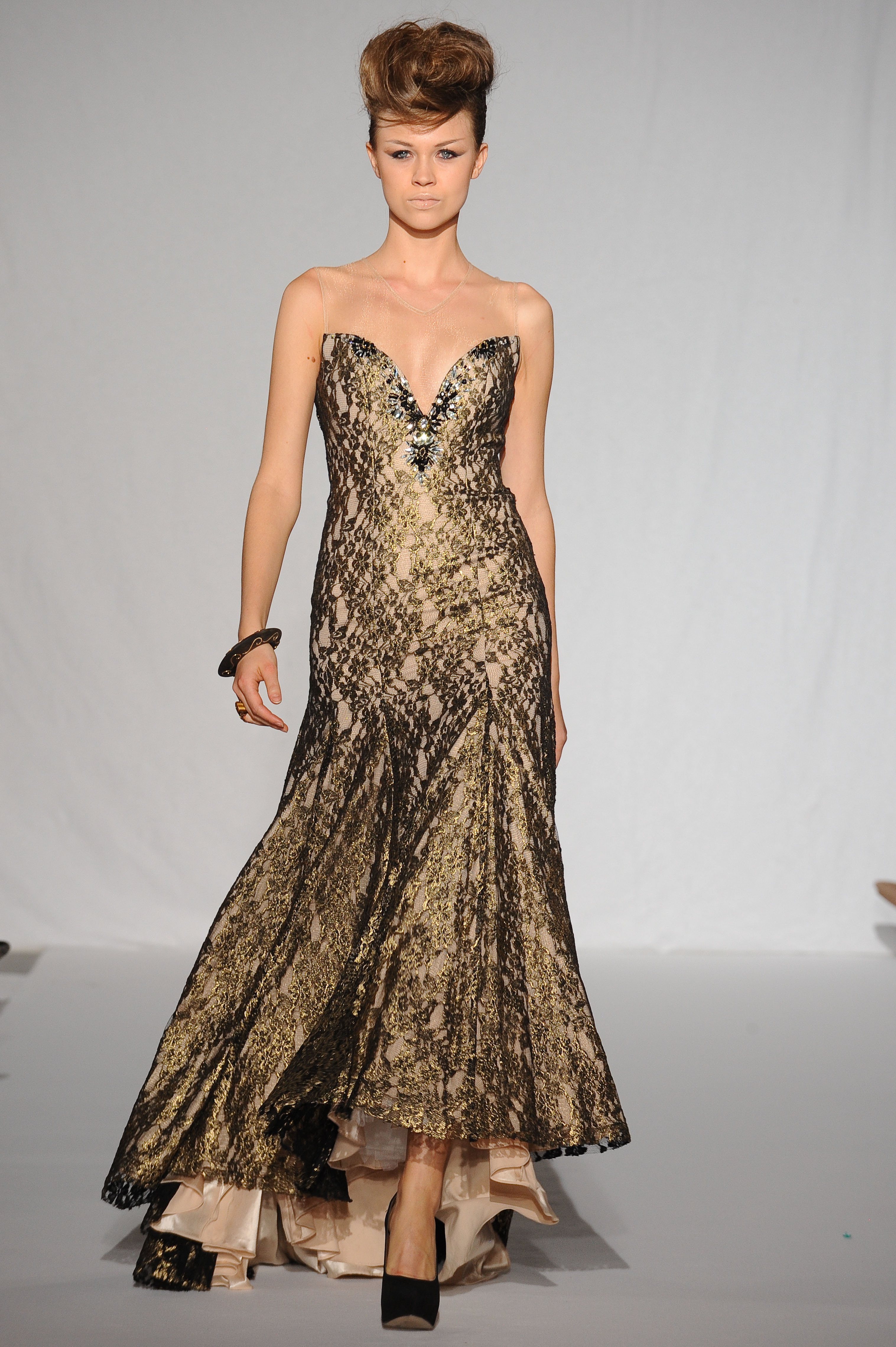 Pour cette âge d’or de la couture quoi de plus naturel que d’honorer le doré souvent marié au blanc immaculé, ou bien au champagne et au beige. Les teintes qui réveillent la collection sont le rose fuchsia, le corail et le rouge lipstick. Le noir demeure pour des fourreaux dramatiques avec des jeux de transparence.