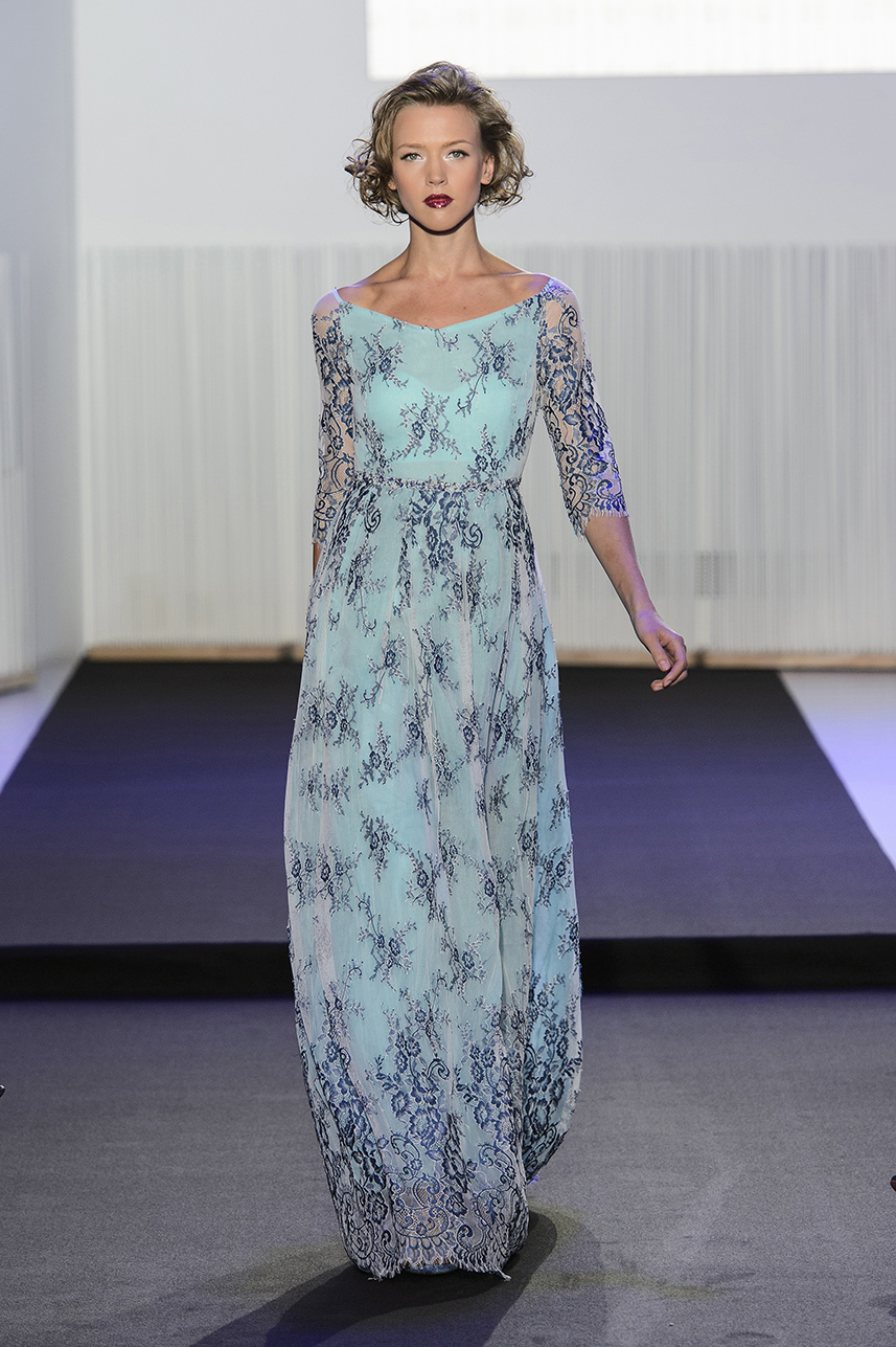 look 5 - robe longue en dentelle turquoise a manches trois quarts et encolure bateau - long dress in lace turquoise with three quarter sleeve and boat neck - Kristina