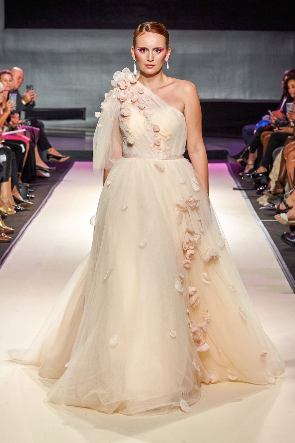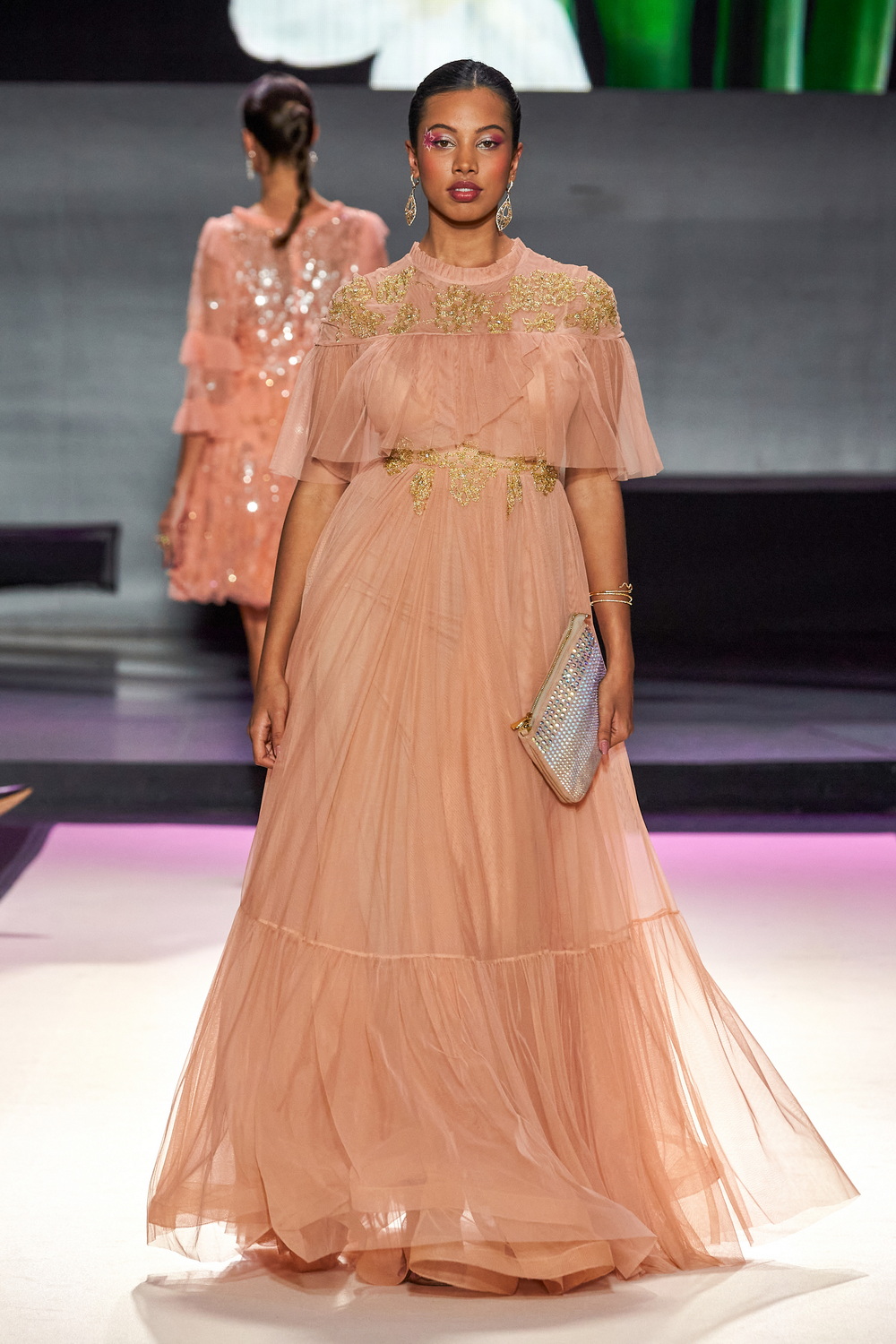 Dans ces transparences de tulle rose poudré, de broderies de fleurs délicates, la collection est une croisière onirique dans un jardin secret. Quelques silhouettes de plantes carnivores esprit Poison Ivy comme ces maxi robes bustier en tulle froissé rouge où les volumes en satin dramatise cette nature revisitée.