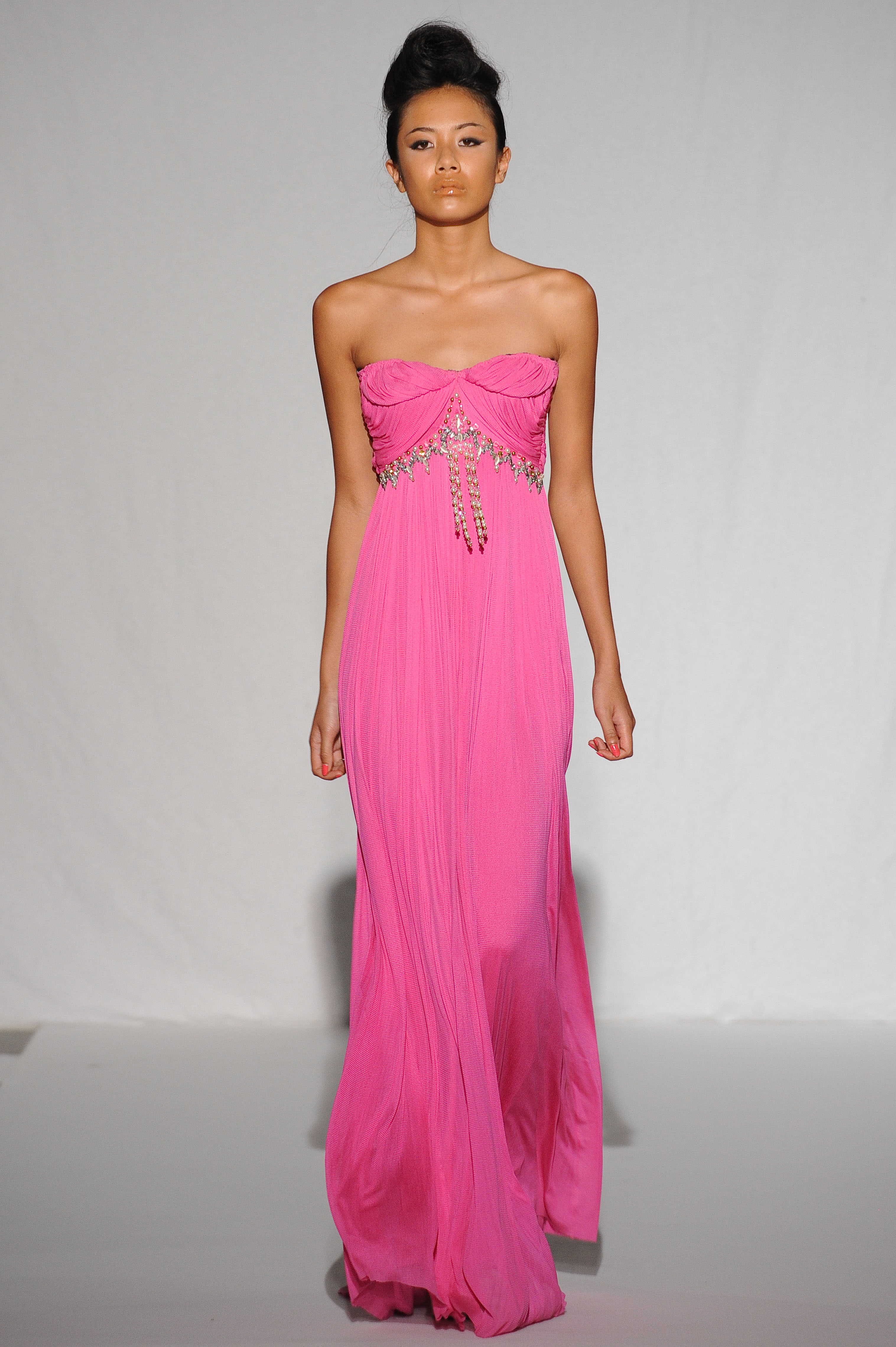 Robe bustier en tulle de soie rose fuchsia au bustier drapé. Fuchsia pink silk tulle gown with draped bust. Céline