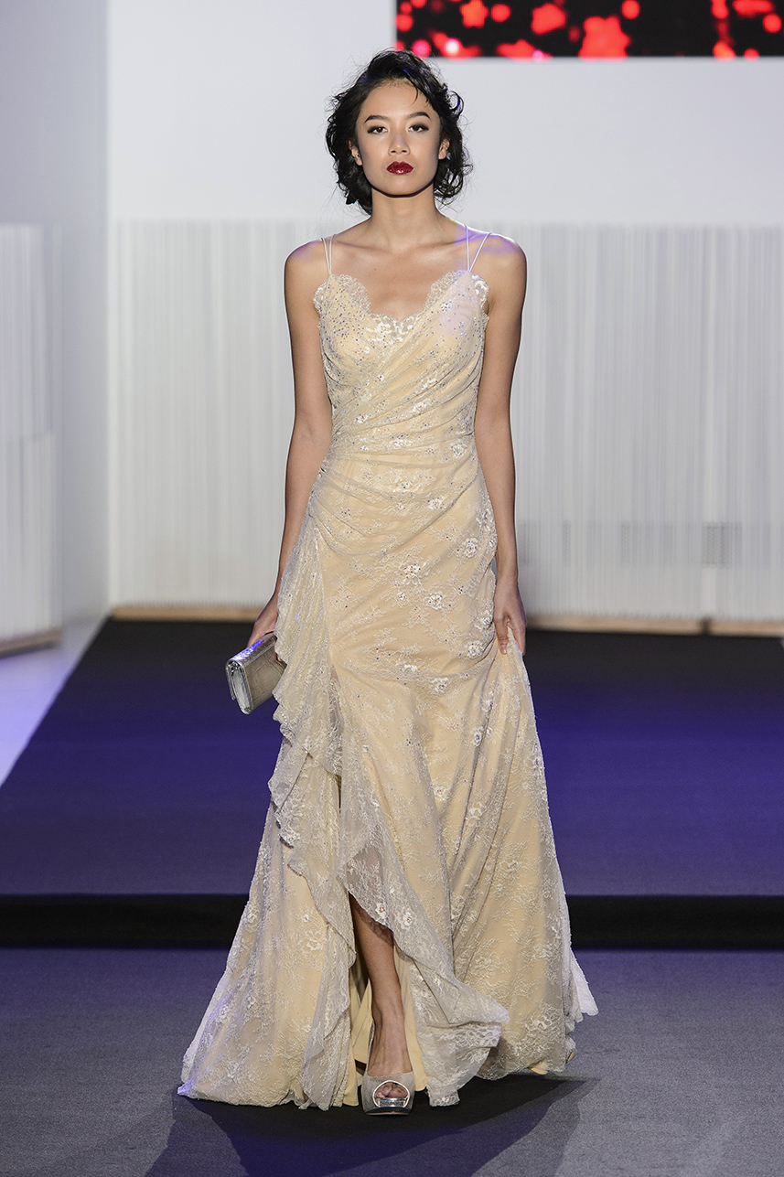 Le gold est à l’honneur, version transparence ou encore appliqué de cristaux. Une esthétique « Old Hollywood » dans le choix des formes tant une robe sirène à bustier ou une encolure bateau esprit rétro.
