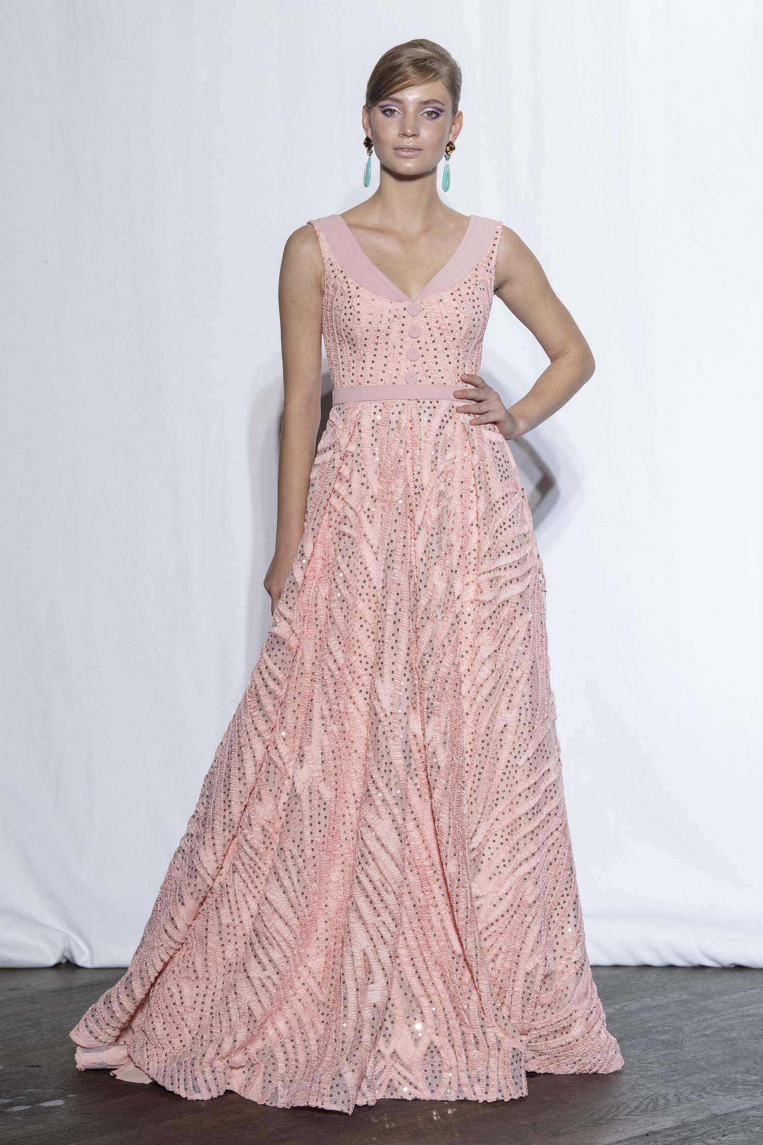 Look 22 - robe longue rose en tulle ornee de rubans fronces et lignes de paillettes - long dress in pink tulle embroidered with ribbons and lines of sequins - Sasha