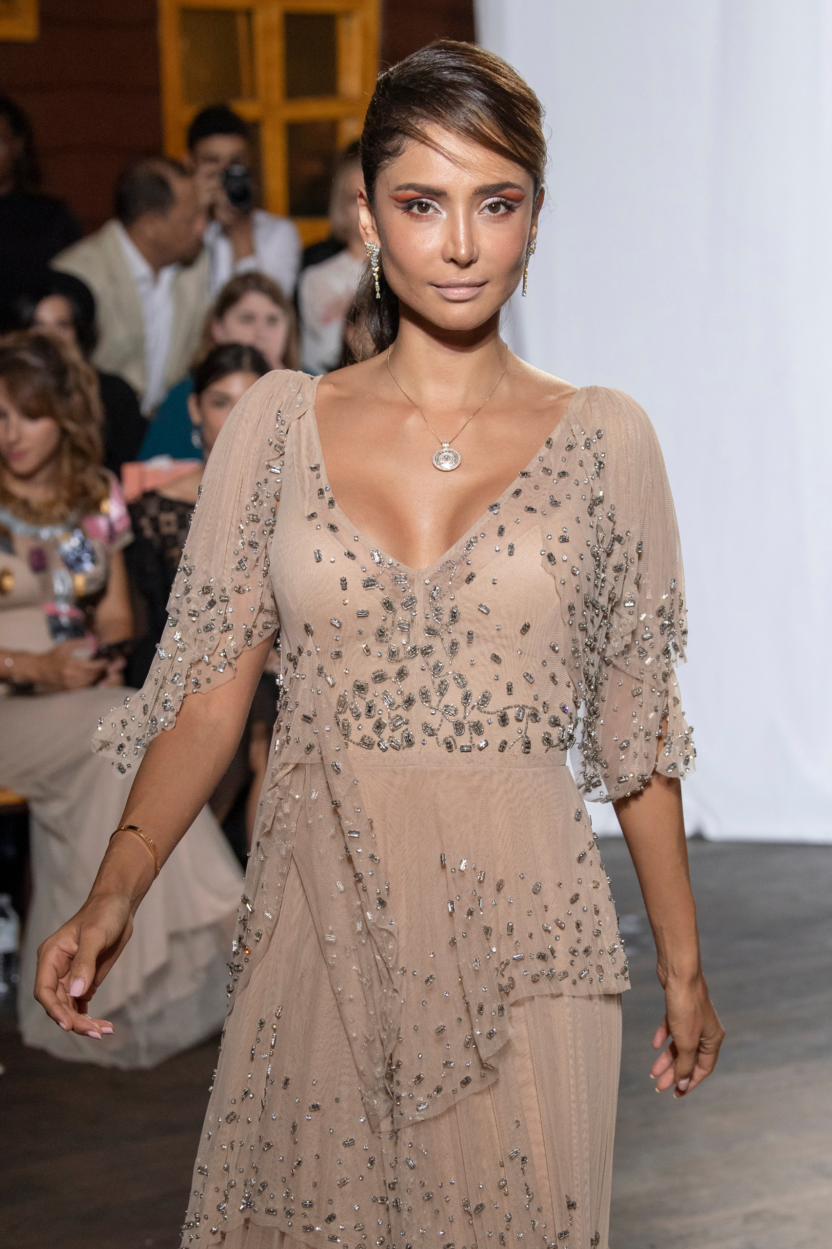 beige tulle dress with beading