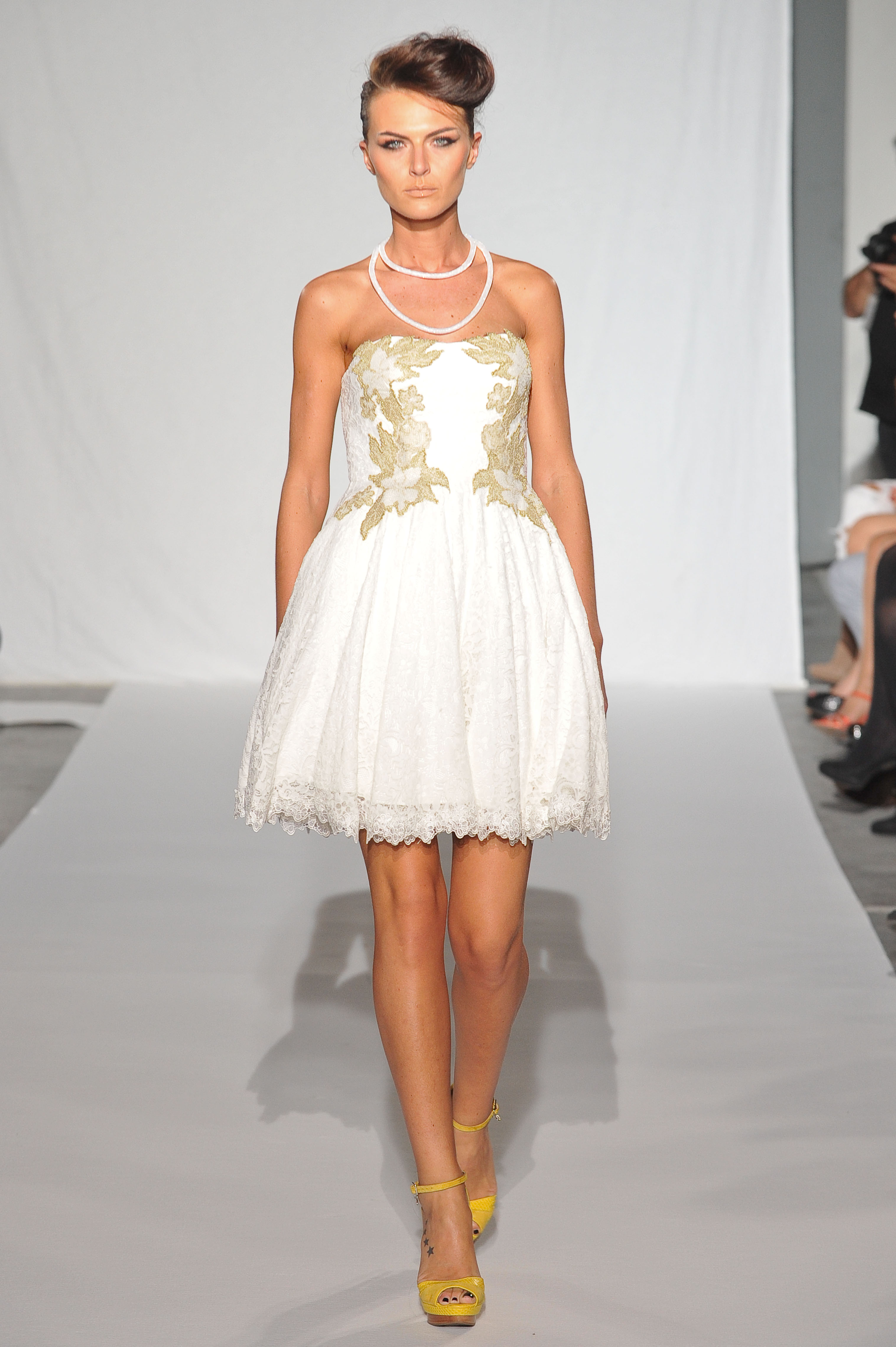 Mini robe en dentelle blanche à jupe évasée appliquée de motifs au point de croix. White lace A line mini bustier dress applique with cross stitch. Lucie
