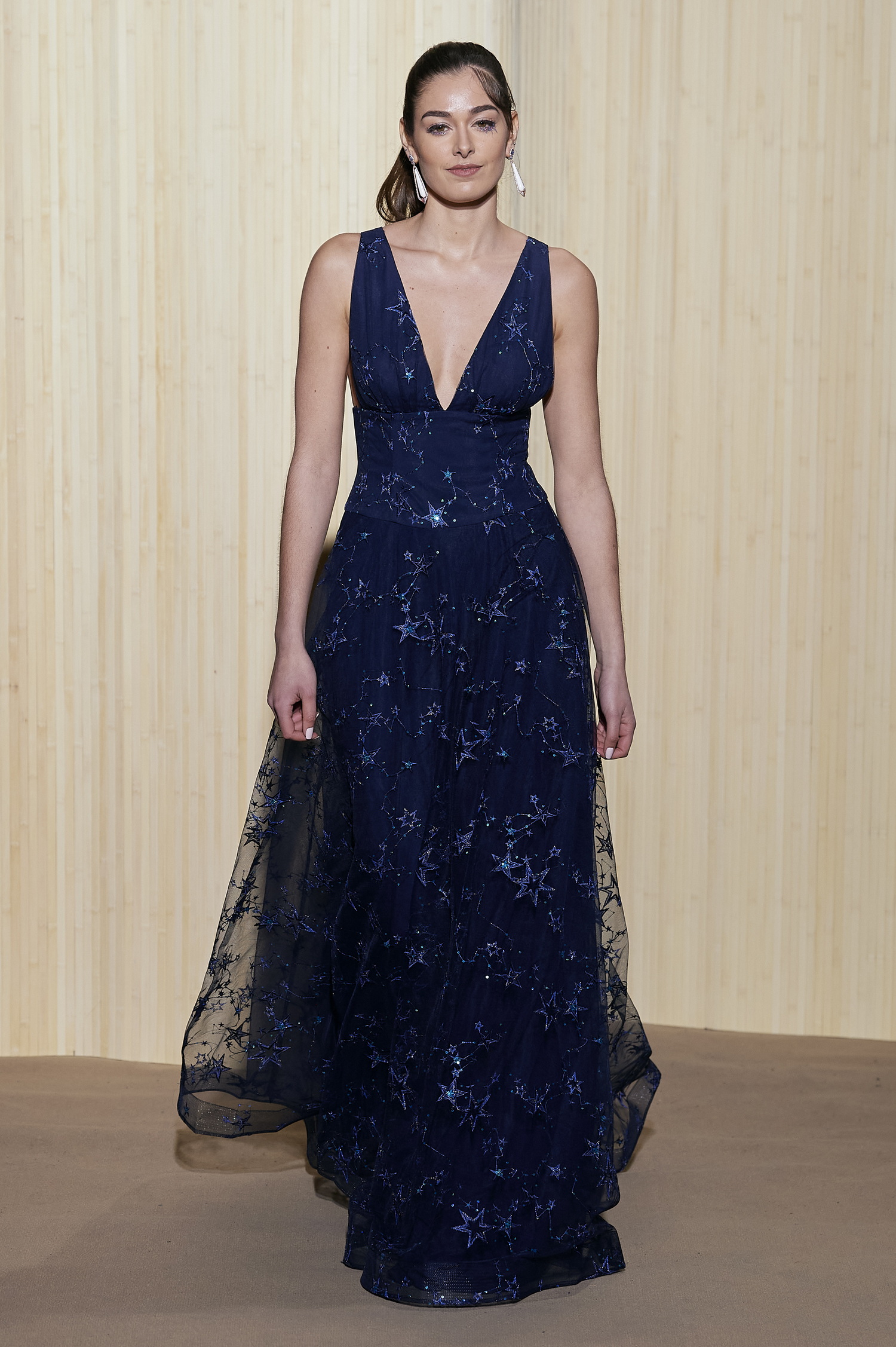 A hieratic and contemporary elegance during a stellar cruise: with comet beading, fireworks jacquards, and a colour range declined around tinted blacks, plum and nude fanned with coral gleams. The navy tulle is embroidered in the milky way.