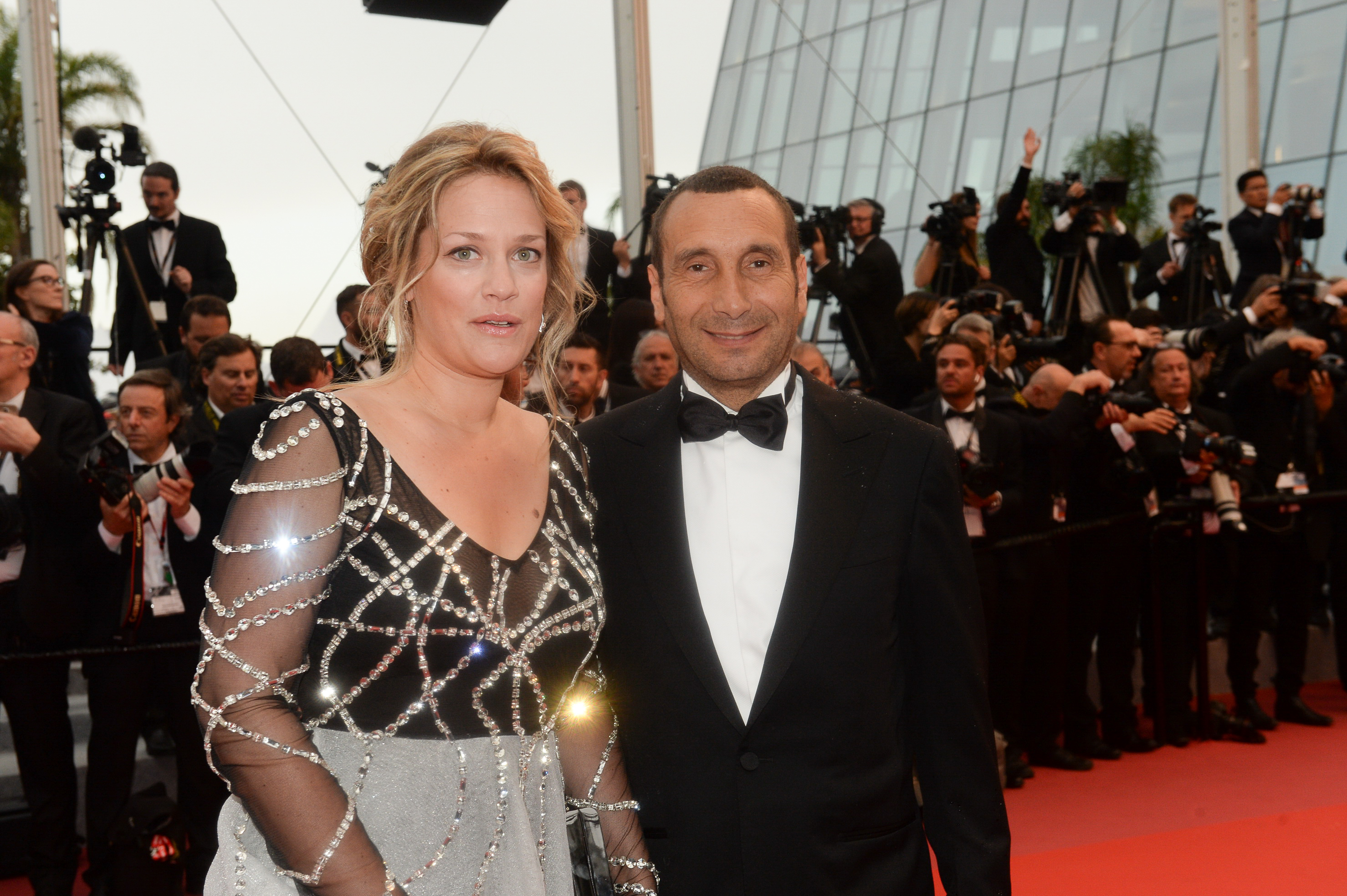 Montee des marches pour la projection du film BURNING de Lee Chang-Dong - Jour 09 - Mercredi 16 Mai - 18h30 - L'artiste peintre Caroline Faind et le comédien Zinedine Soualem - longue robe Christophe Guillarme en tulle - buste noir brode de cristaux et jupe en tulle argent - minaudiere et escarpins Carmen Steffens - coiffure Eros Giuliani - maquillage Make Up For Ever
