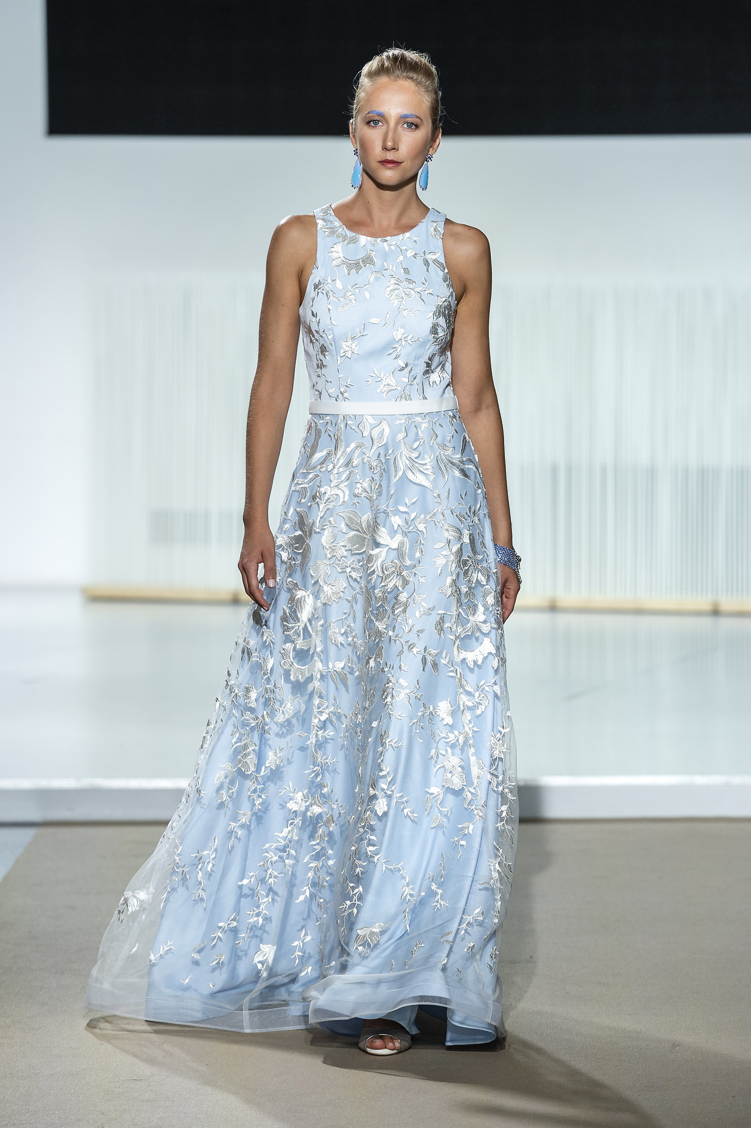 look 12 - longue robe emmanchures americaines en tulle blanc brode et double en bleu azur - neck overlay long gown in white tulle embroidered and lined in soft blue colour - Amelie