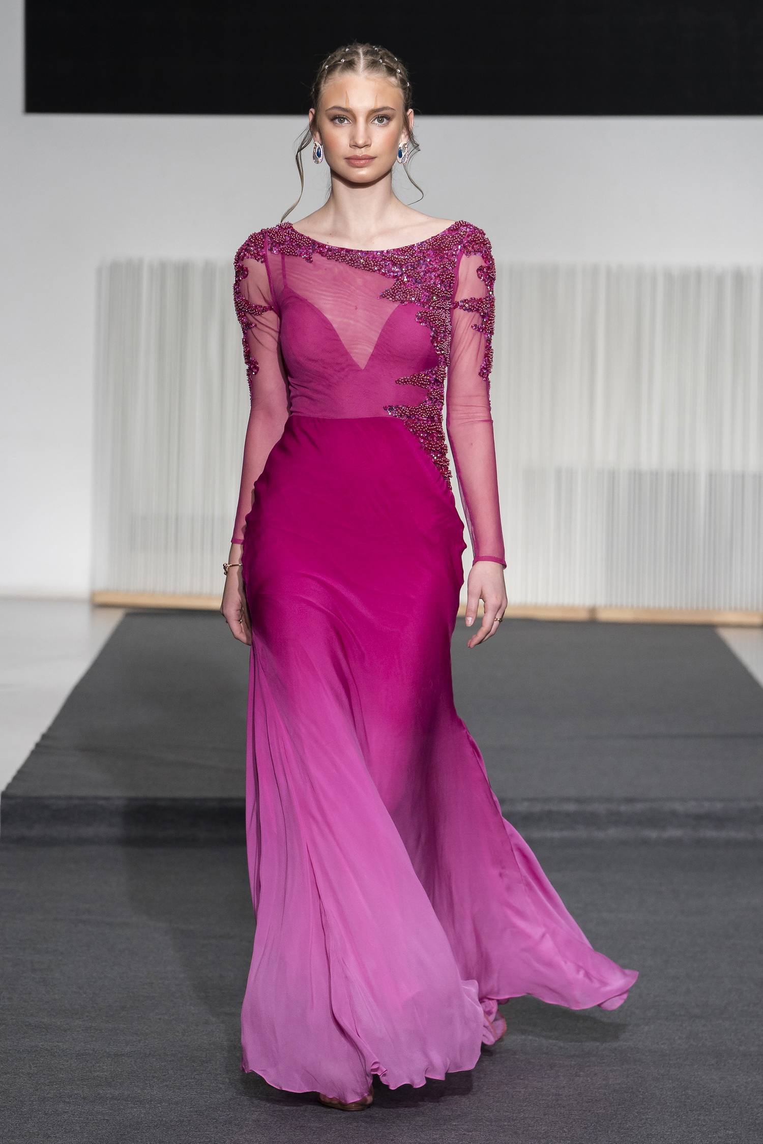Look 13 - fourreau en mousseline de soie ombree fuchsia en biais rebrode en relief - burgundy ombre silk chiffon bias gown with relief beading - Sasha