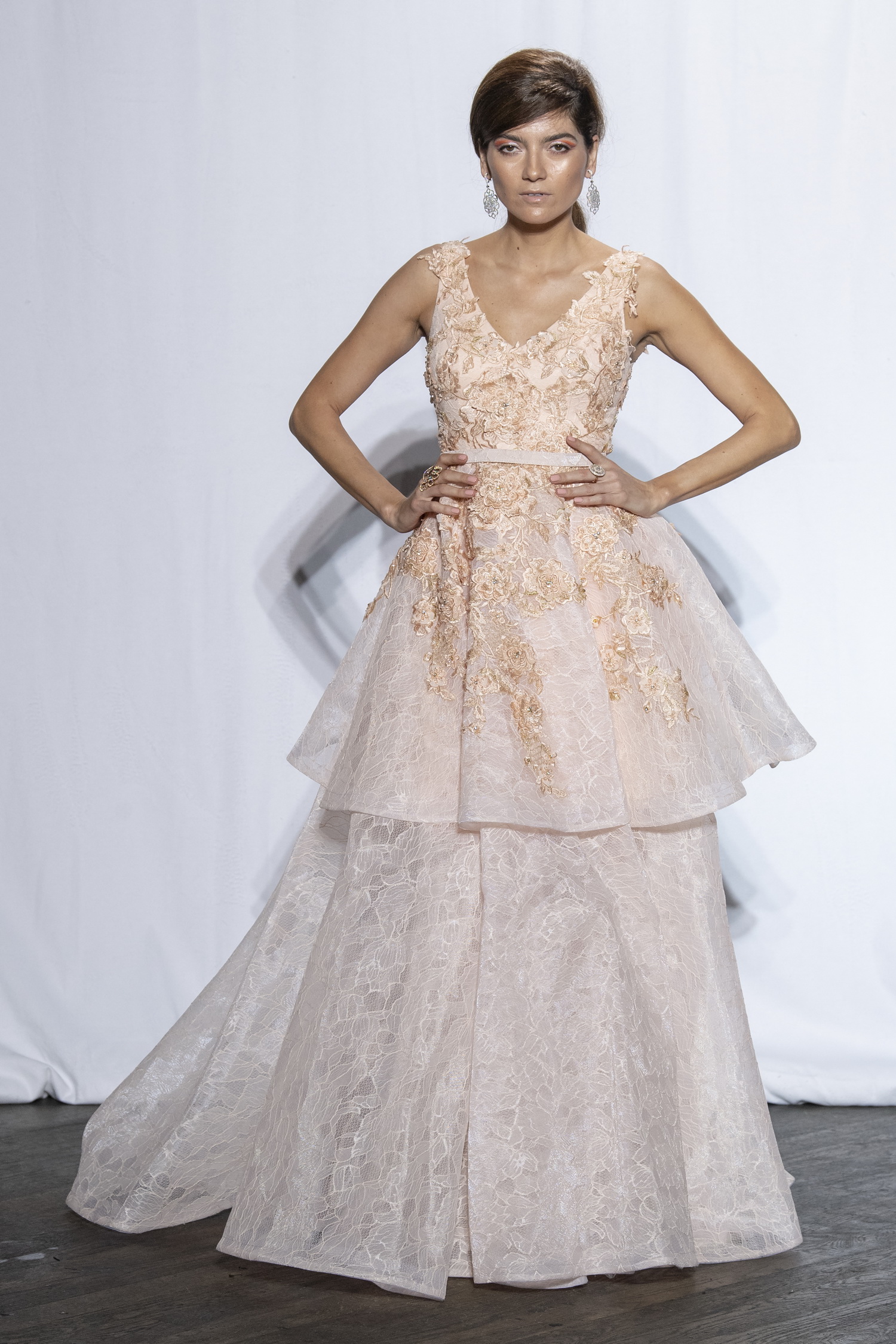 Look 24 - maxi robe en dentelle peche rebrodee d’applications fleuries - maxi dress in peach lace applied with flowery lace patches - Blanca Blanco