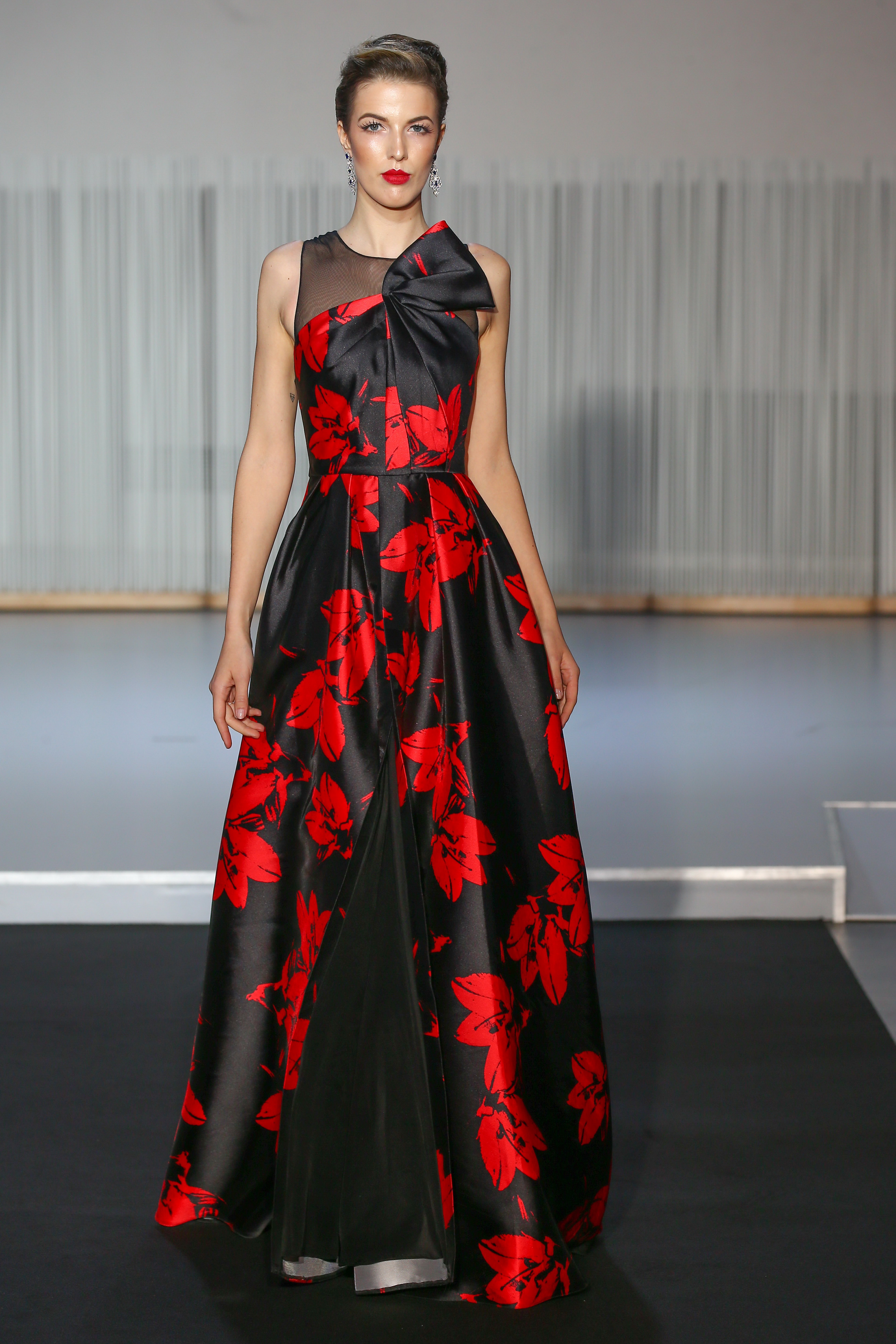 look 13 - longue robe portefeuille en faille de soie, imprimee rouge et noir - red & black printed overlapped mikado silk long dress - Meryl