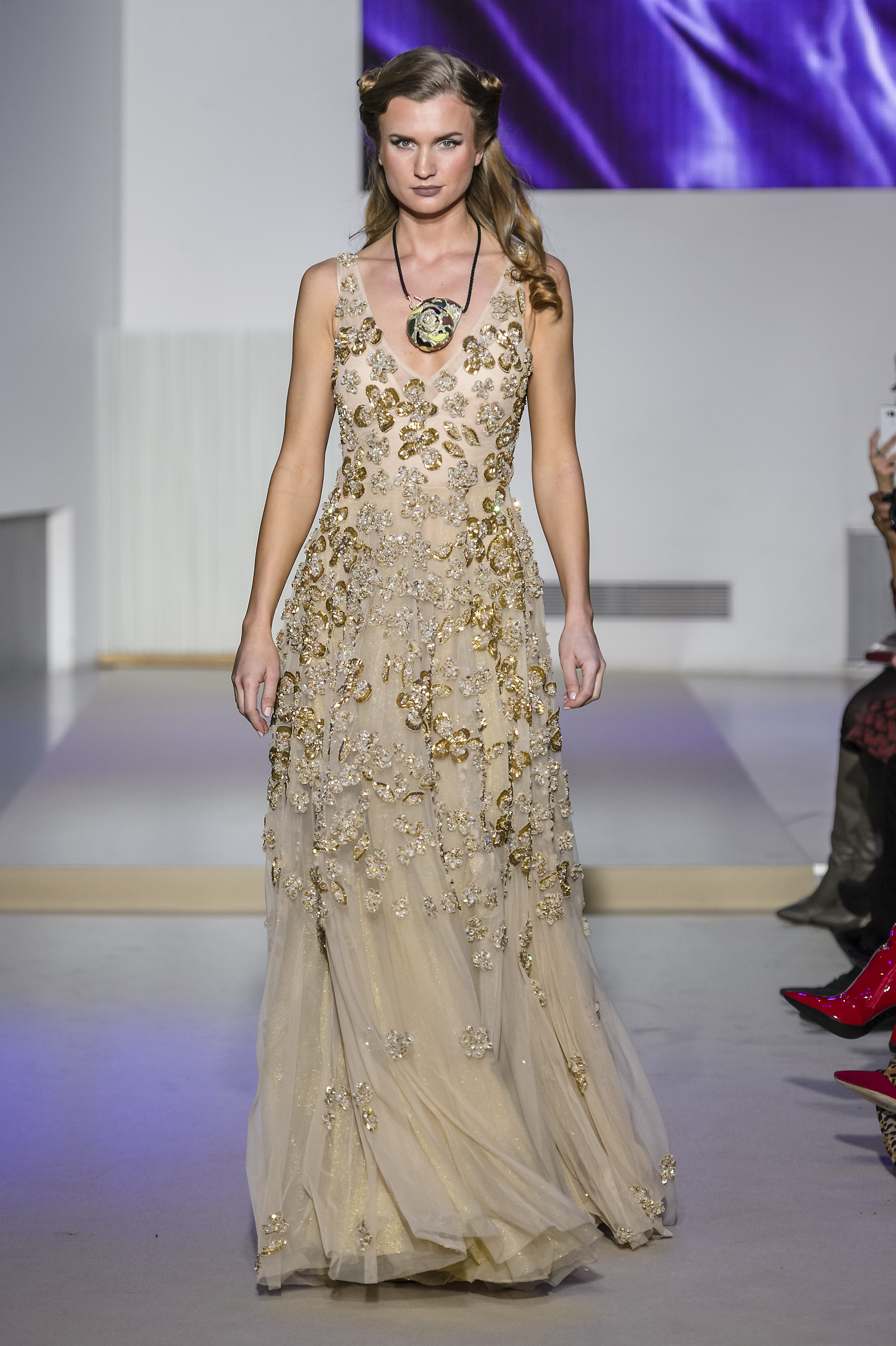 Layering of petticoats in seethrough tulle seems to be a current vision of gorgeous Nefertiti, temptress and delicate. She also reveals herself magnificent in an incredible strapless cloak dress. Declinations of beaded crystal baguettes adds sparkles and glamour into this digital world to this surviving icon from Dolce Vita, that reflects in this mystical and enchanting collection.
