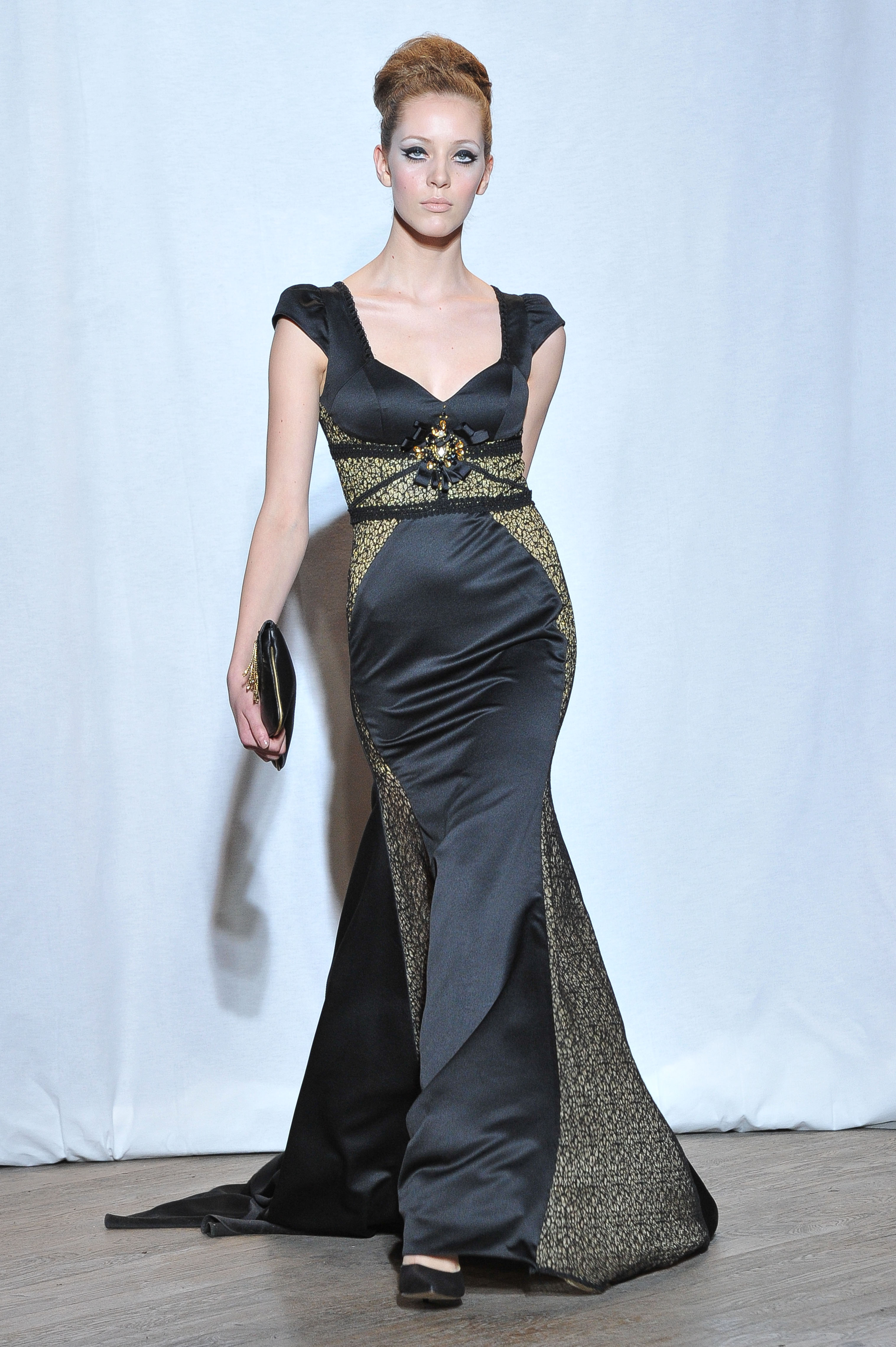 Fourreau en dentelle noir doublé de satin camel et souligné de pierreries à l encolure. Black lace gown lined with cognac satin and neckline outlined with crystal stones. Gia.