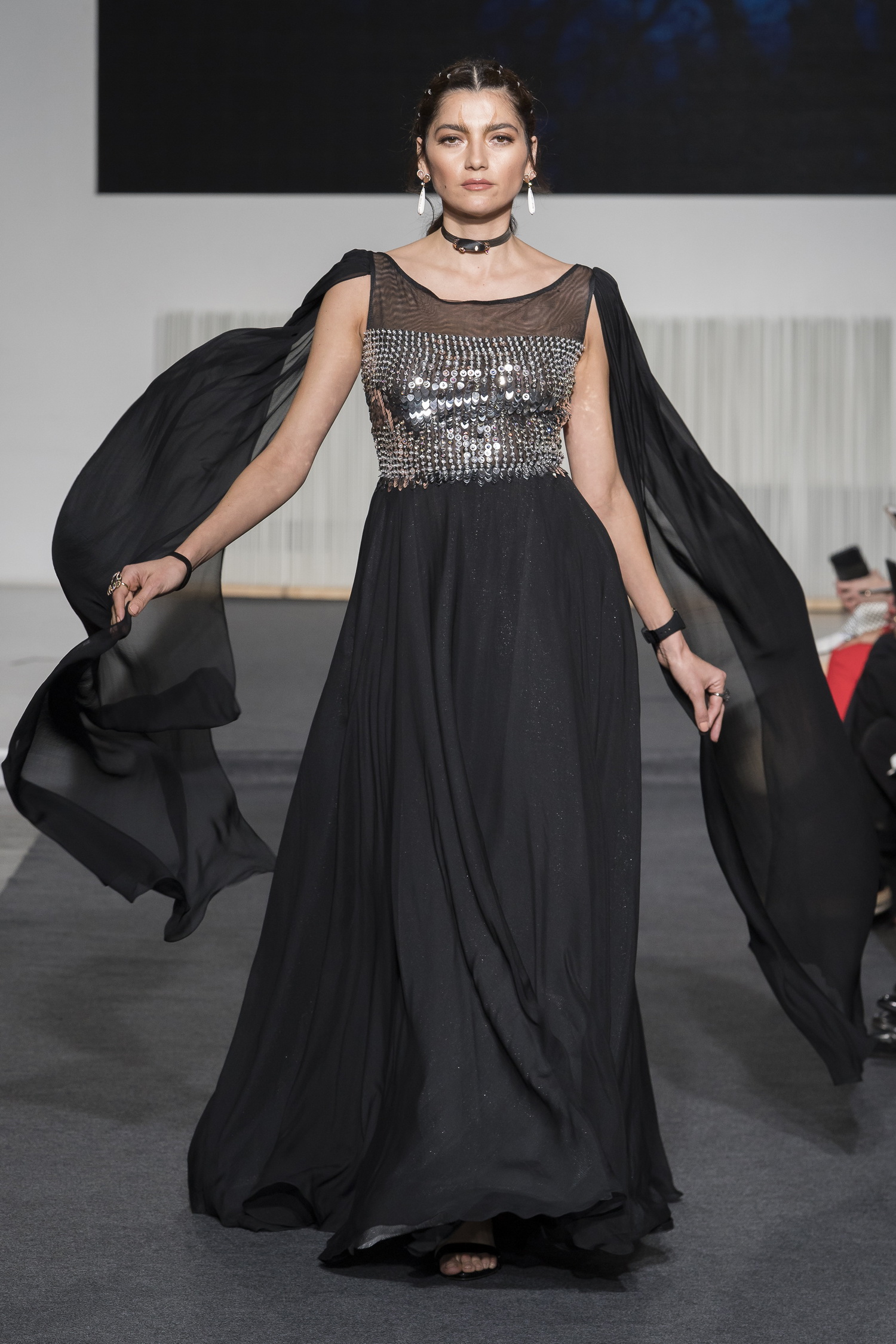 Look 24 - large robe en mousseline de soie noire et panneaux au buste rebrode de sequins argentes - black silk chiffon dress with silver sequins on bust - Blanca Blanco