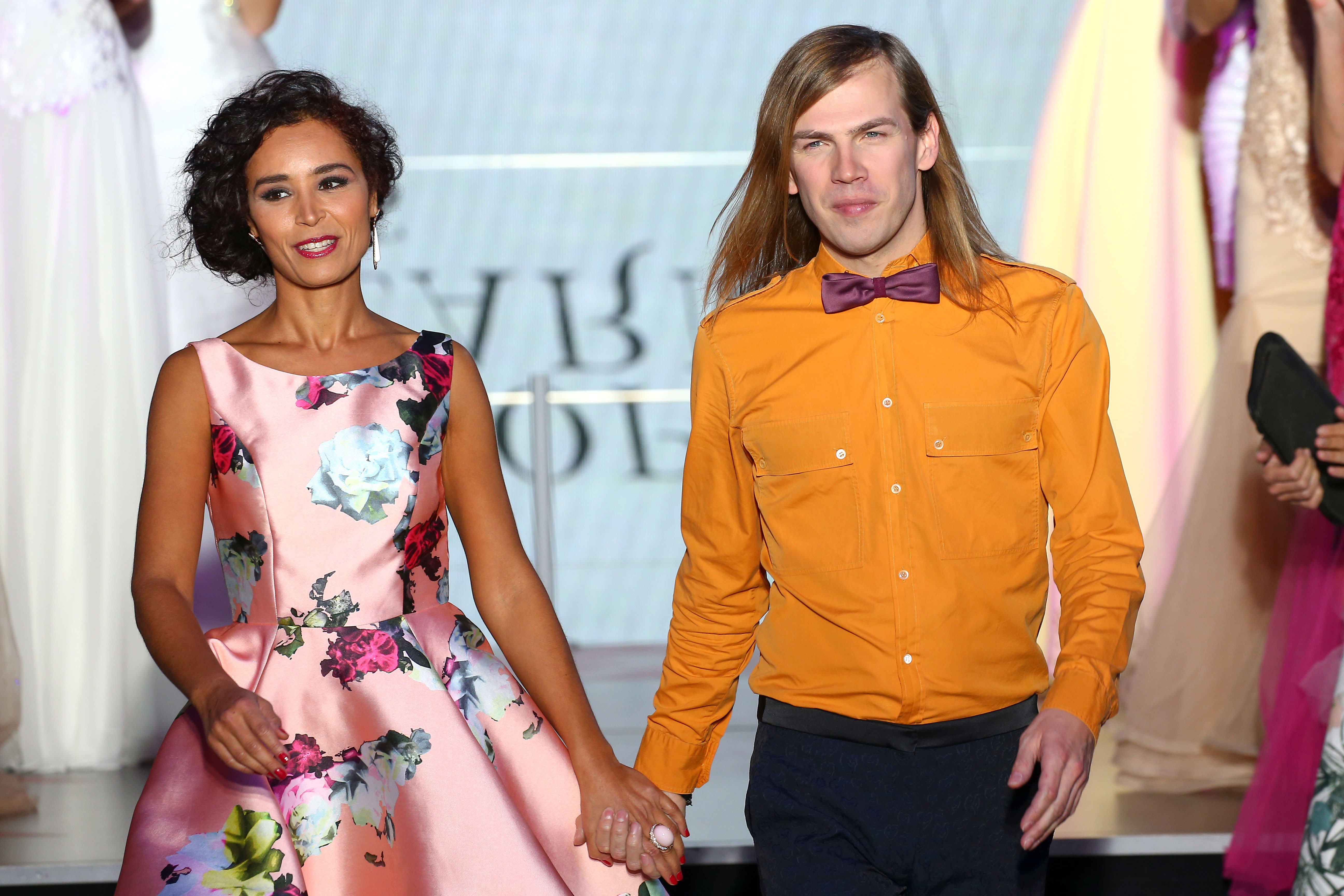 Aida Touihri D8 et Christophe Guillarme - robe en faille de soie imprimee. printed taffeta dress with open back