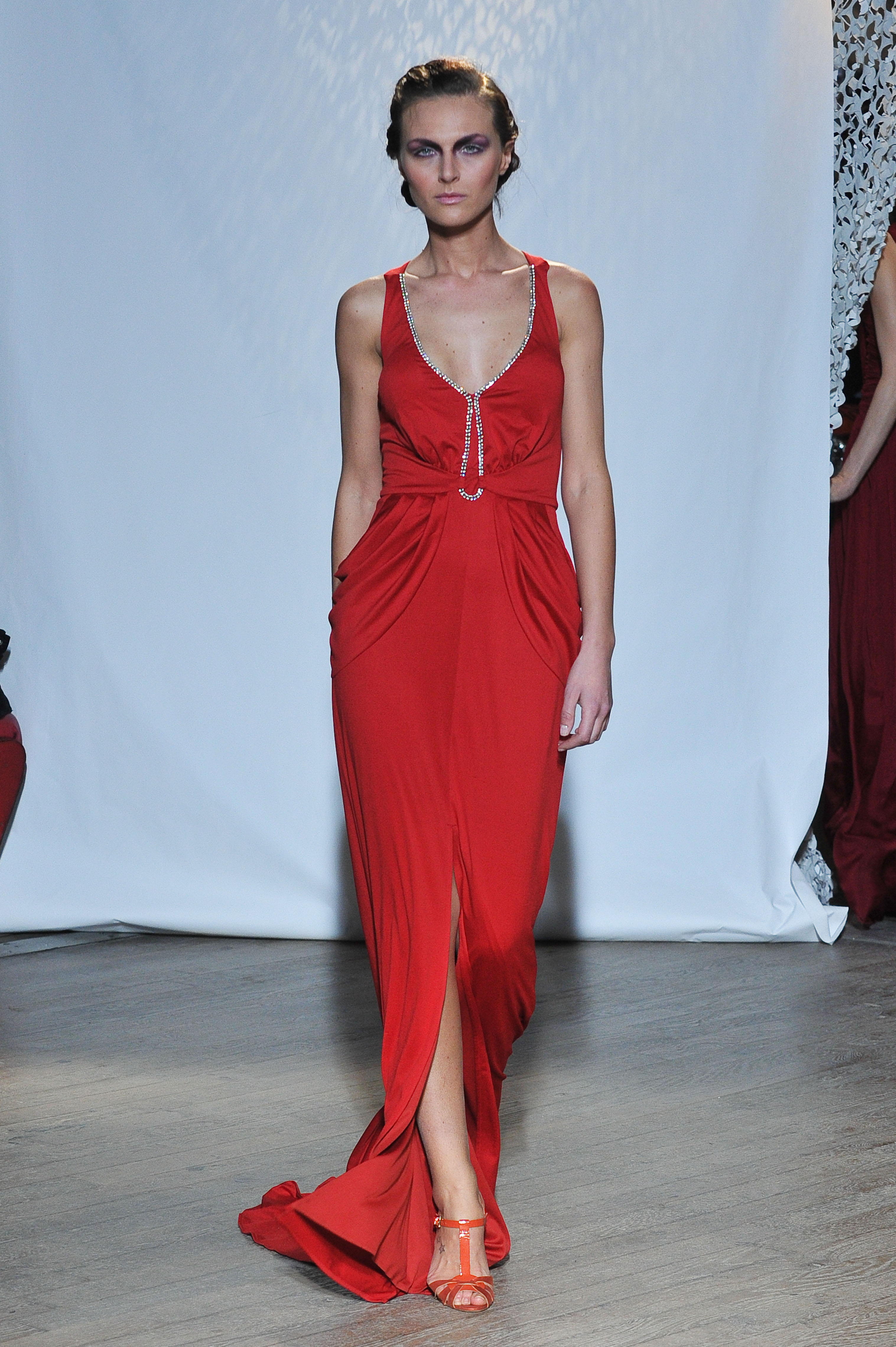 Fall-Winter 2013-2014 fashion show «Boheme» - Christophe Guillarme Paris - Tuesday February 26th 2013 at Balajo - Paris Fashion Week - Fourreau en jersey rouge rubis souligné d une ligne de cristal. - Ruby jersey gown outlined with a crystal line. Lucie