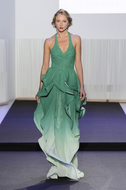 Look 26 - longue robe en mousseline de soie vert emeraude ombre a volant buste plisse - long ombre emerald green silk chiffon dress with frilly skirt and draped bust - Amélie