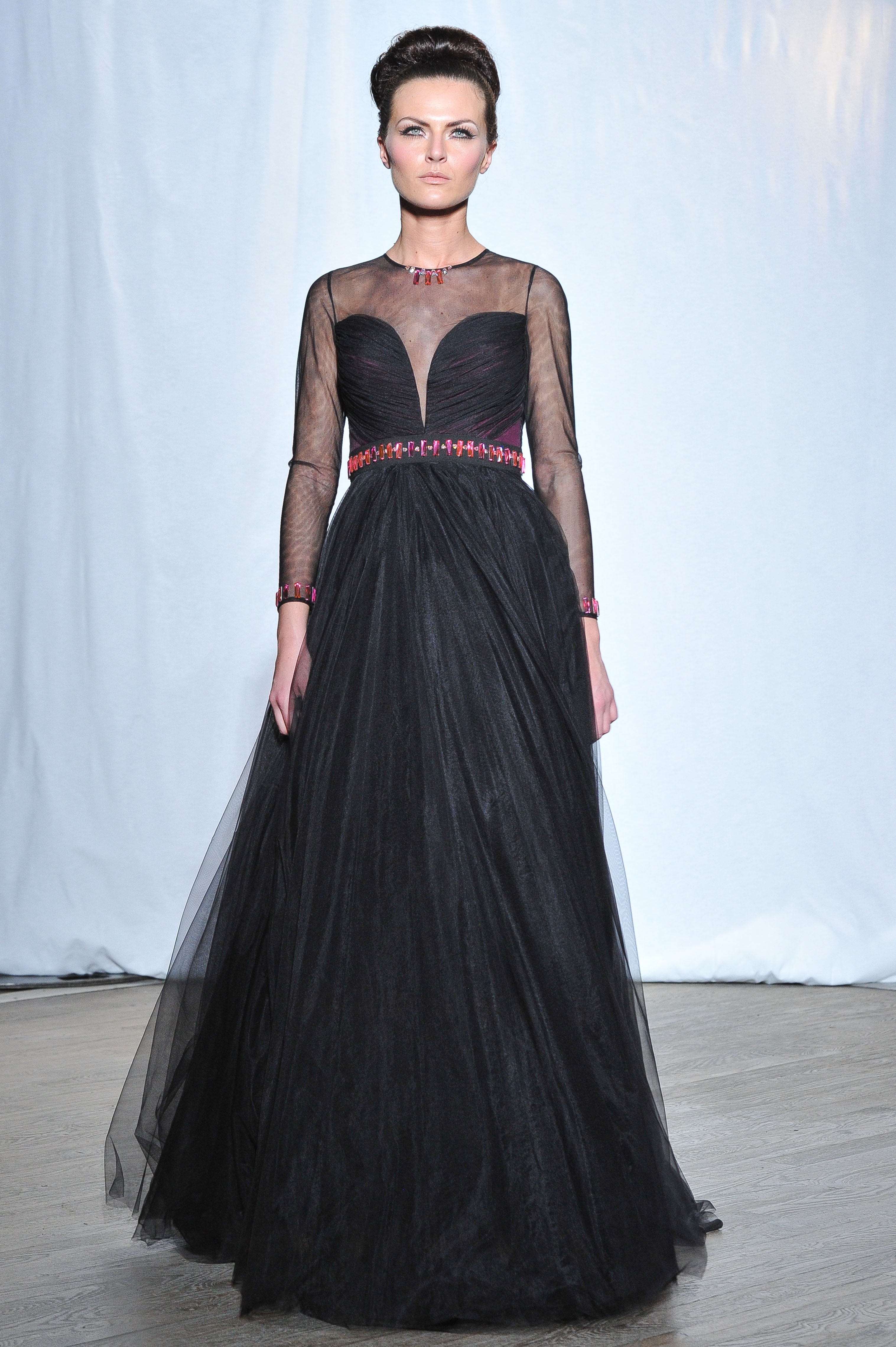 Maxi robe en tulle noir au buste fendu. Black maxi dress with sheer plunging neckline. Lucie. Christophe Guillarme Collection Automne-Hiver 2014-2015 "Miss Polly"