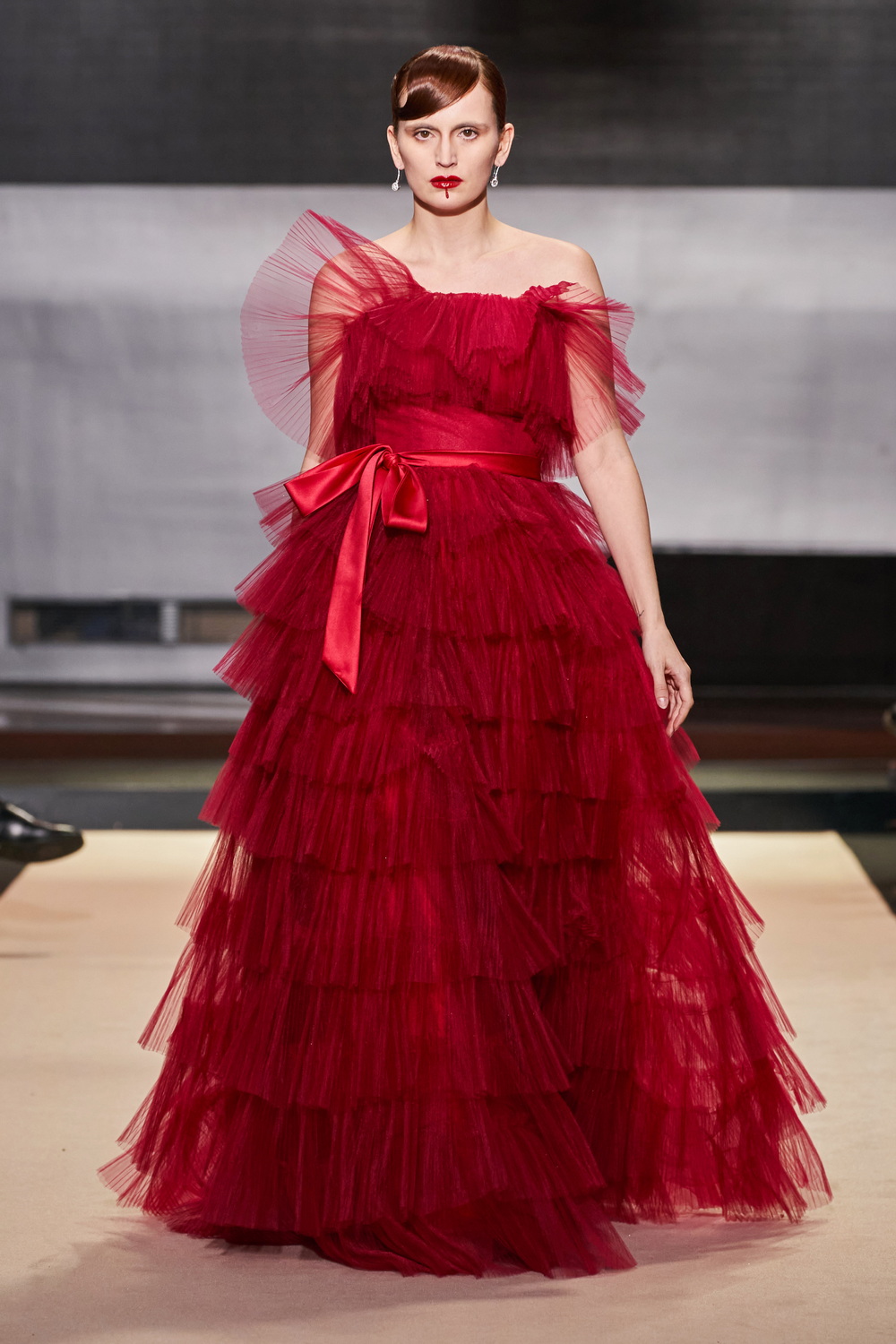 look 22 - maxi robe bustier Christophe Guillarmé en volants de tulle plissé rouge pourpre - dark red tulle Christophe Guillarmé maxi bustier dress with pleated frills - Agatha Maksimova