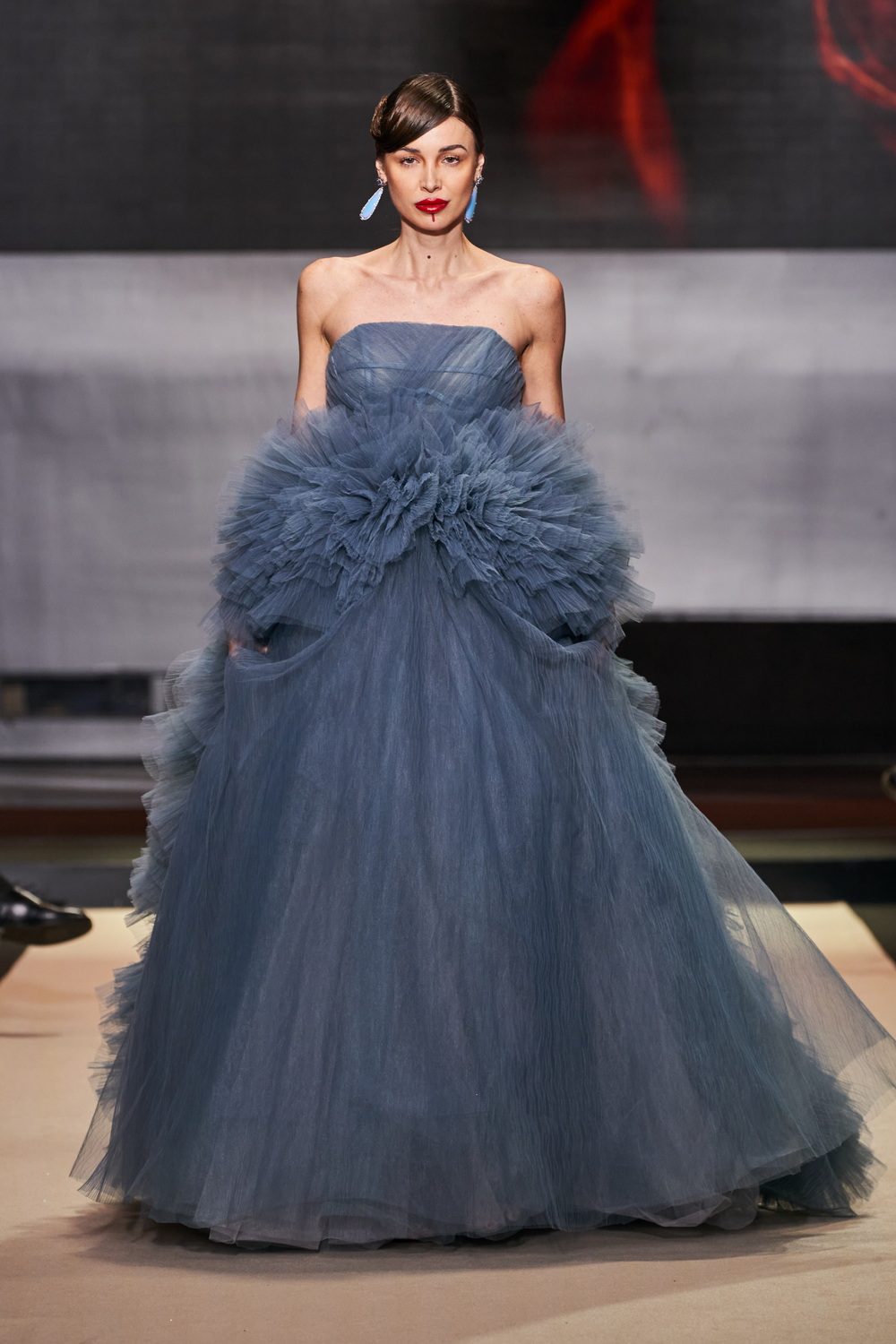 look 26 - maxi robe bustier Christophe Guillarmé en tulle froissé bleu à volutes autour de la taille - Christophe Guillarmé maxi bustier dress in crushed blue tulle with ruches over the waist & sides - Lara Leito
