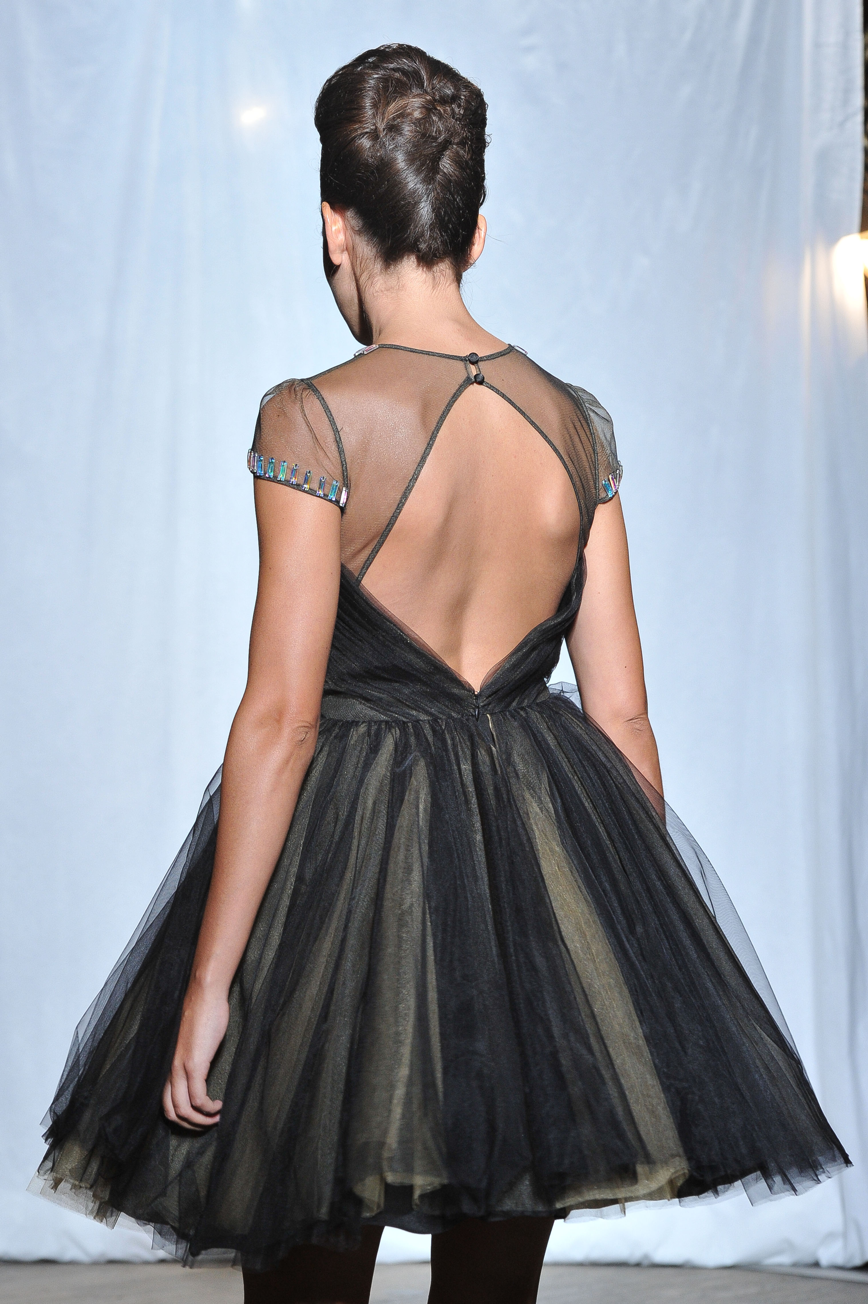 Pop touches are used in colours among fuchsia pink, turquoise blue, ruby red or purple-blue to lighten numbers of black and gold styles. Duchess satin is all over the collection mostly used in hugely spectacular dresses as much as Tulle for ethereral maxi dresses. Few ethnic beadings are reminding psychedelic Goa.