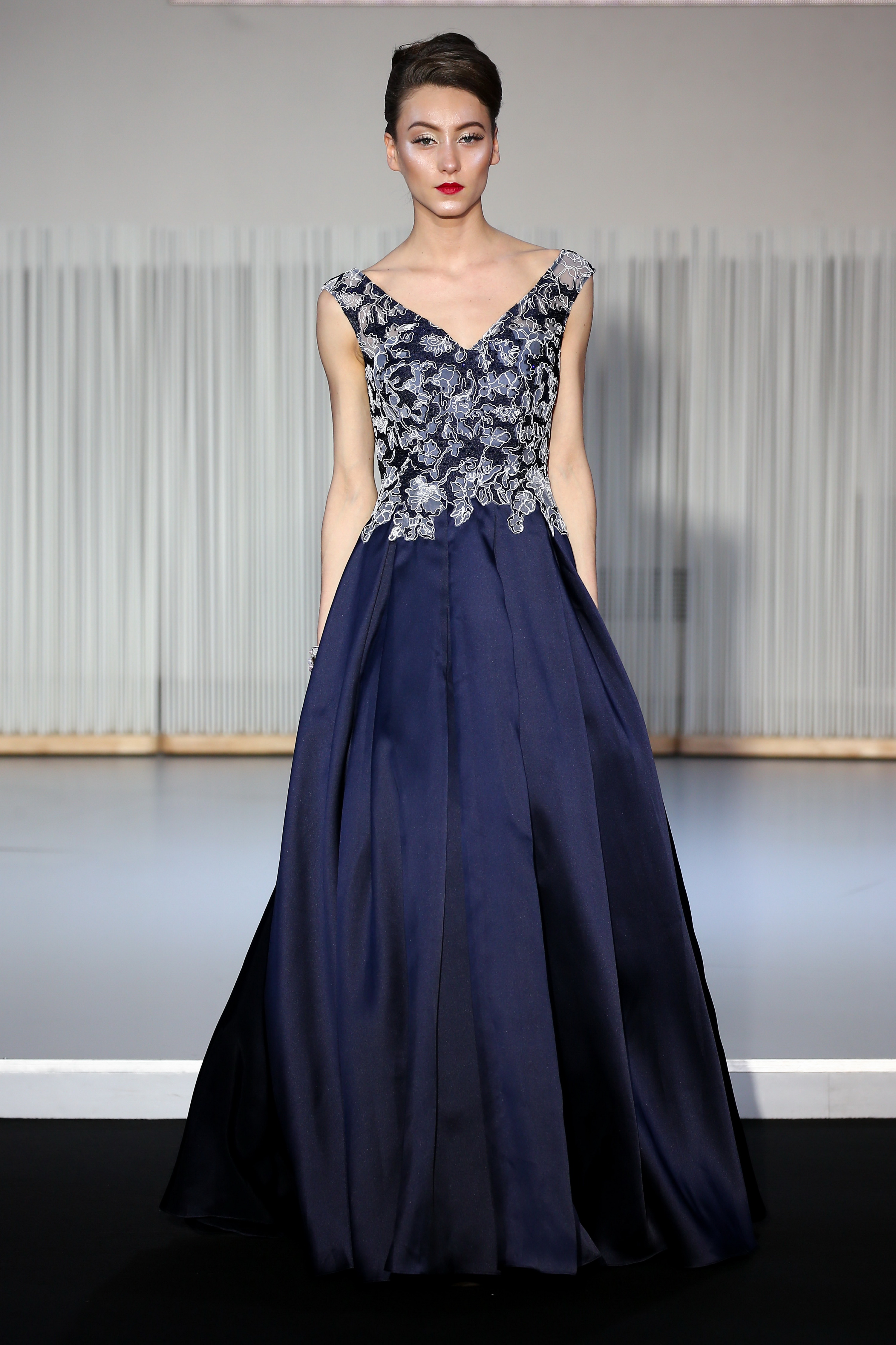 look 23 - maxi robe en satin et dentelle rebrodee bleu marine - navy blue silk satin mix with lace maxi dress - Anna