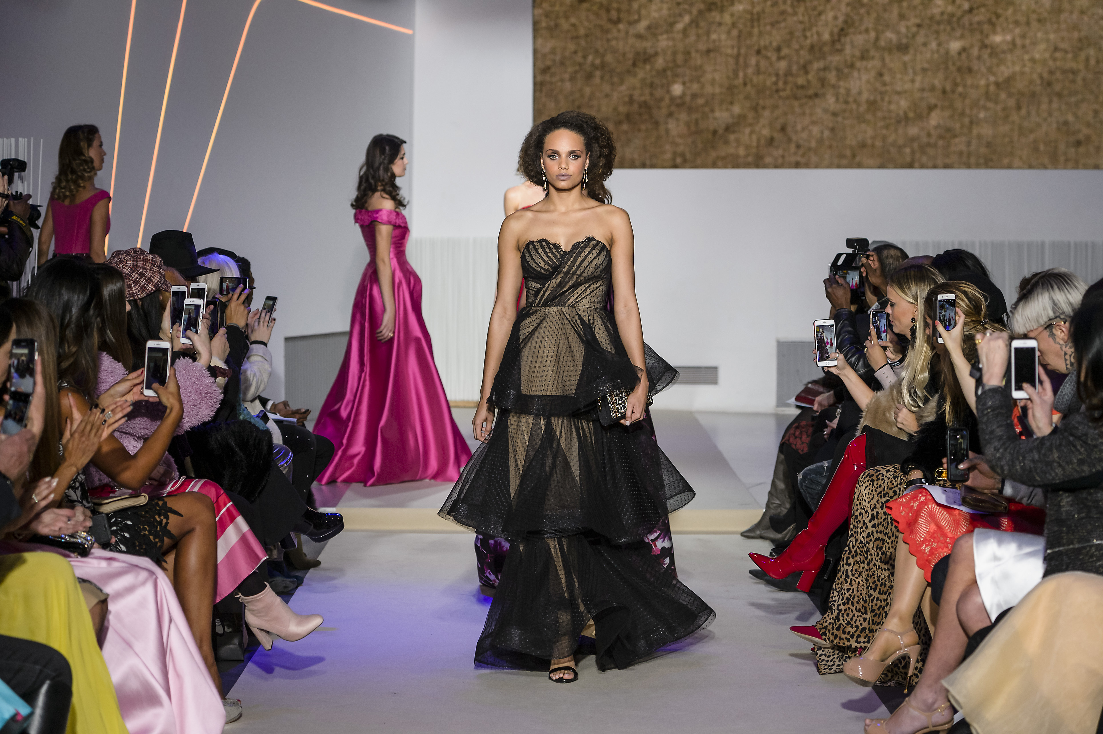 Layering of petticoats in seethrough tulle seems to be a current vision of gorgeous Nefertiti, temptress and delicate. She also reveals herself magnificent in an incredible strapless cloak dress. Declinations of beaded crystal baguettes adds sparkles and glamour into this digital world to this surviving icon from Dolce Vita, that reflects in this mystical and enchanting collection.