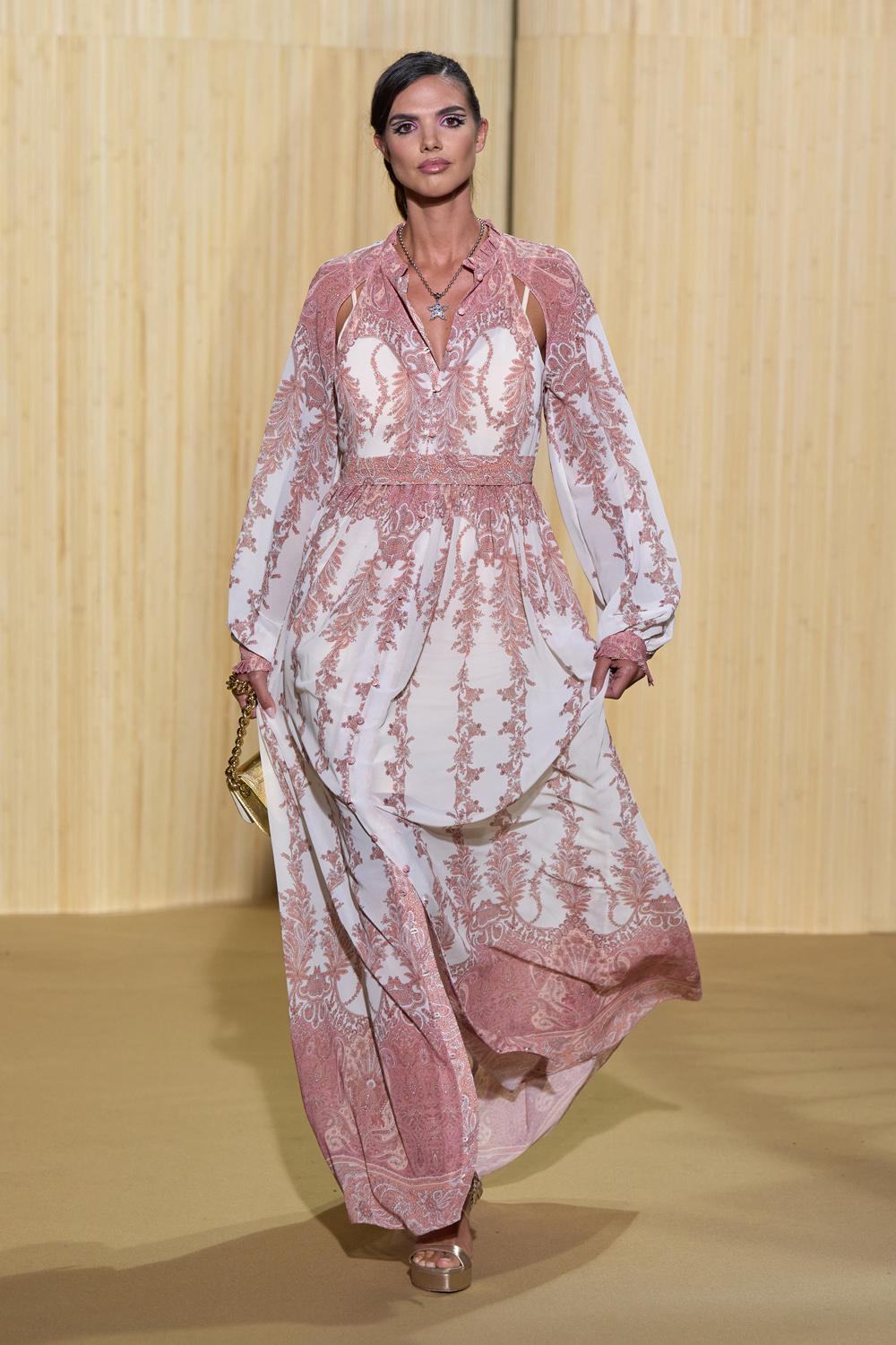 look 06 - longue robe chemise fendue en mousseline de soie imprimée beige - long slit shirt dress in beige printed silk chiffon - Annaëlle