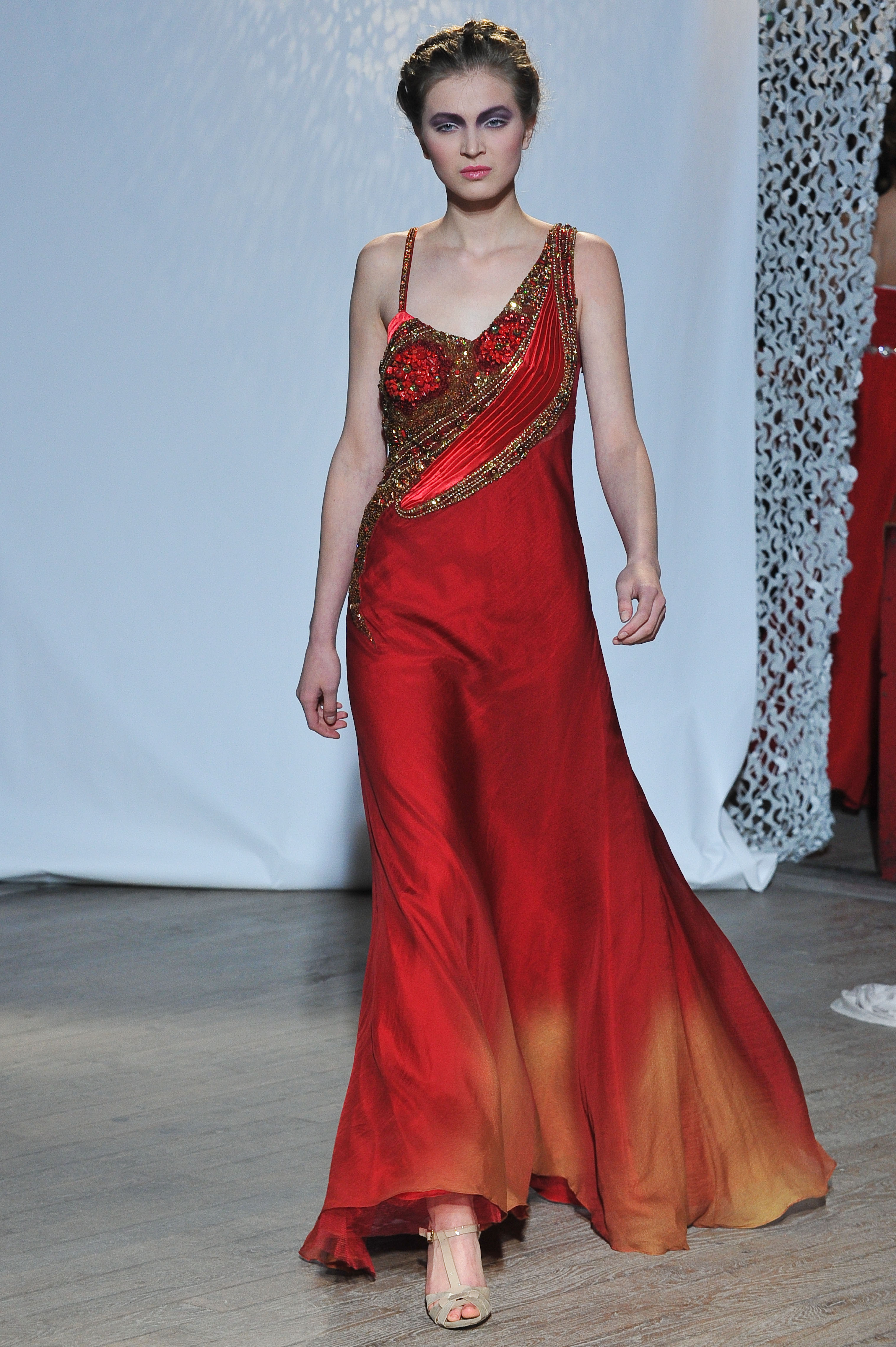 Fall-Winter 2013-2014 fashion show «Boheme» - Christophe Guillarme Paris - Tuesday February 26th 2013 at Balajo - Paris Fashion Week - Longue robe asymétrique en georgette desoie rouge ombrée au buste rebrodé. - Red shaded silk georgette asymetric long dress with embroidered bust . Marya